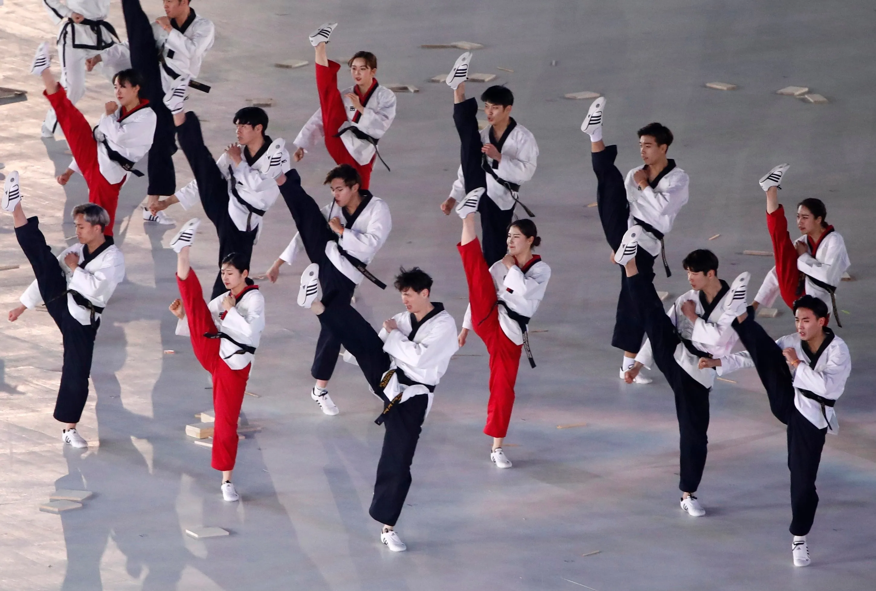 Martial arts practitioners from North Korea perform ahead of the opening ceremony of the 2018 Winter Olympics in Pyeongchang, South Korea, Friday, February 9, 2018. (Photo by Stefano Rellandini/Reuters)