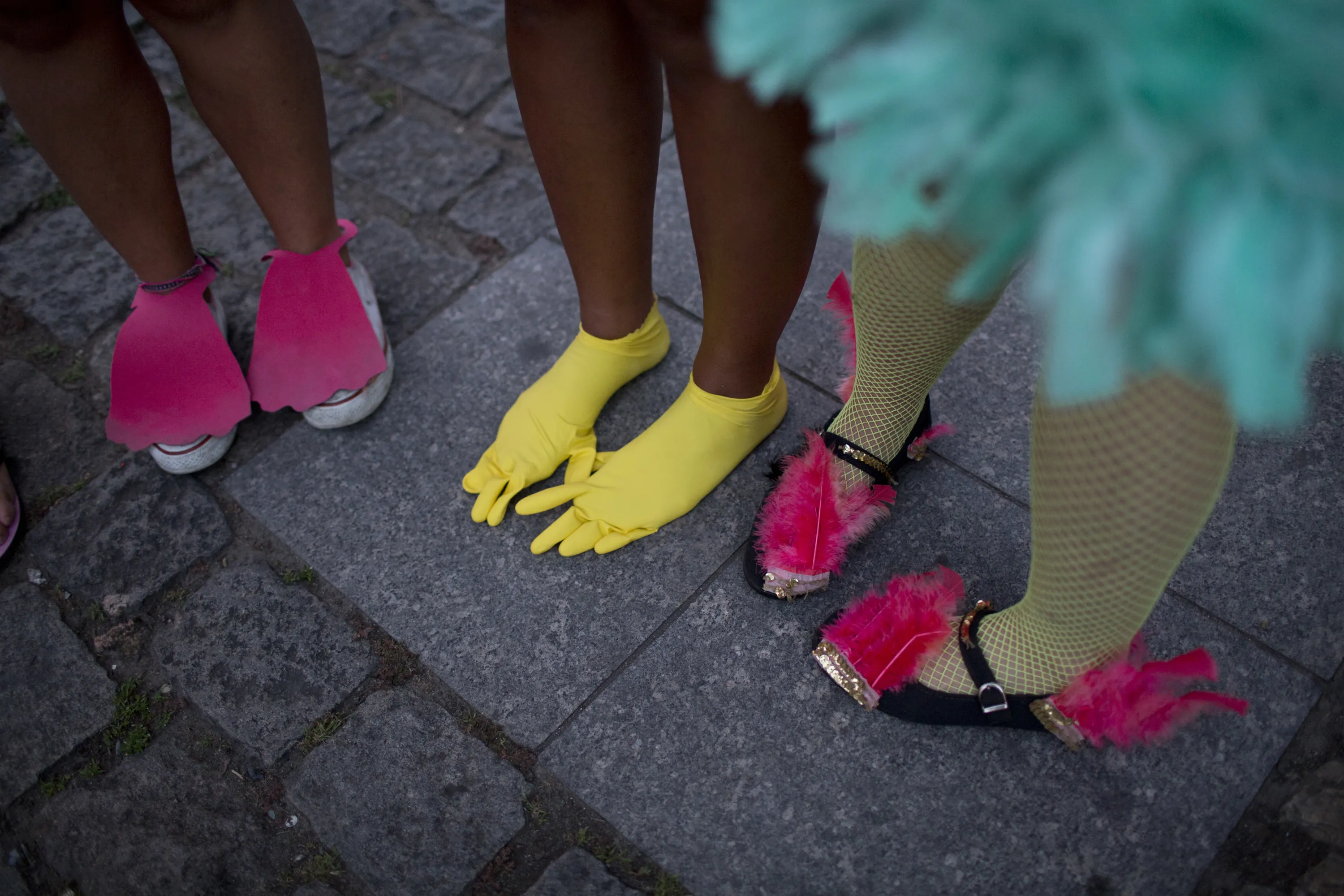In this February 3, 2018 photo, a woman wears plastic, yellow gloves on her feet as part of her bird costume during the block party “Maria vem com as outras”, or “Maria, join the other women”, in Rio de Janeiro, Brazil. Many women in Latin America's largest nation are doing exactly that during this year's Carnival celebrations, with block parties of all-female musicians, popular accessories with messages like “my breasts, my rules” and several campaigns to report and crackdown on harassment. (Photo by Silvia Izquierdo/AP Photo)