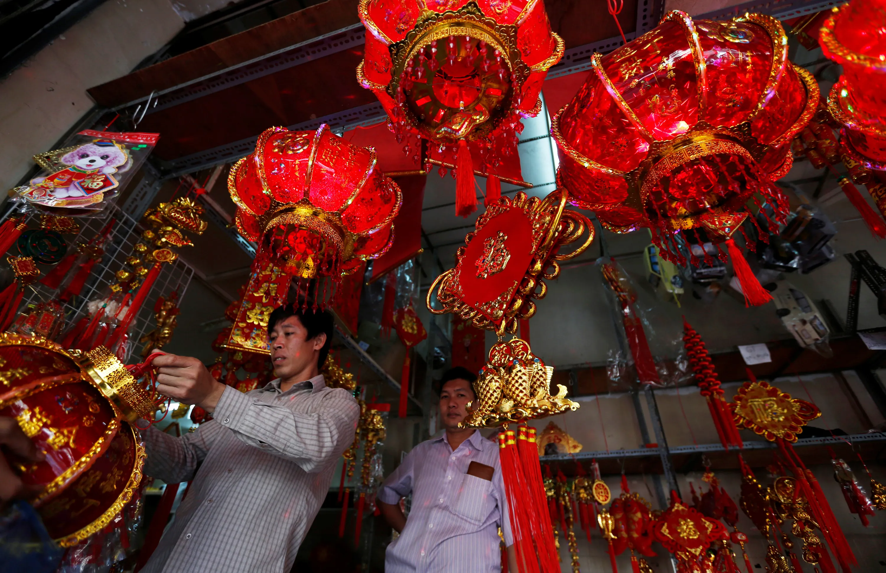 A man prepares lanterns and decorations for sale at a market ahead of the Chinese Lunar New Year in central Phnom Penh, Cambodia, February 13, 2018. (Photo by Samrang Pring/Reuters)