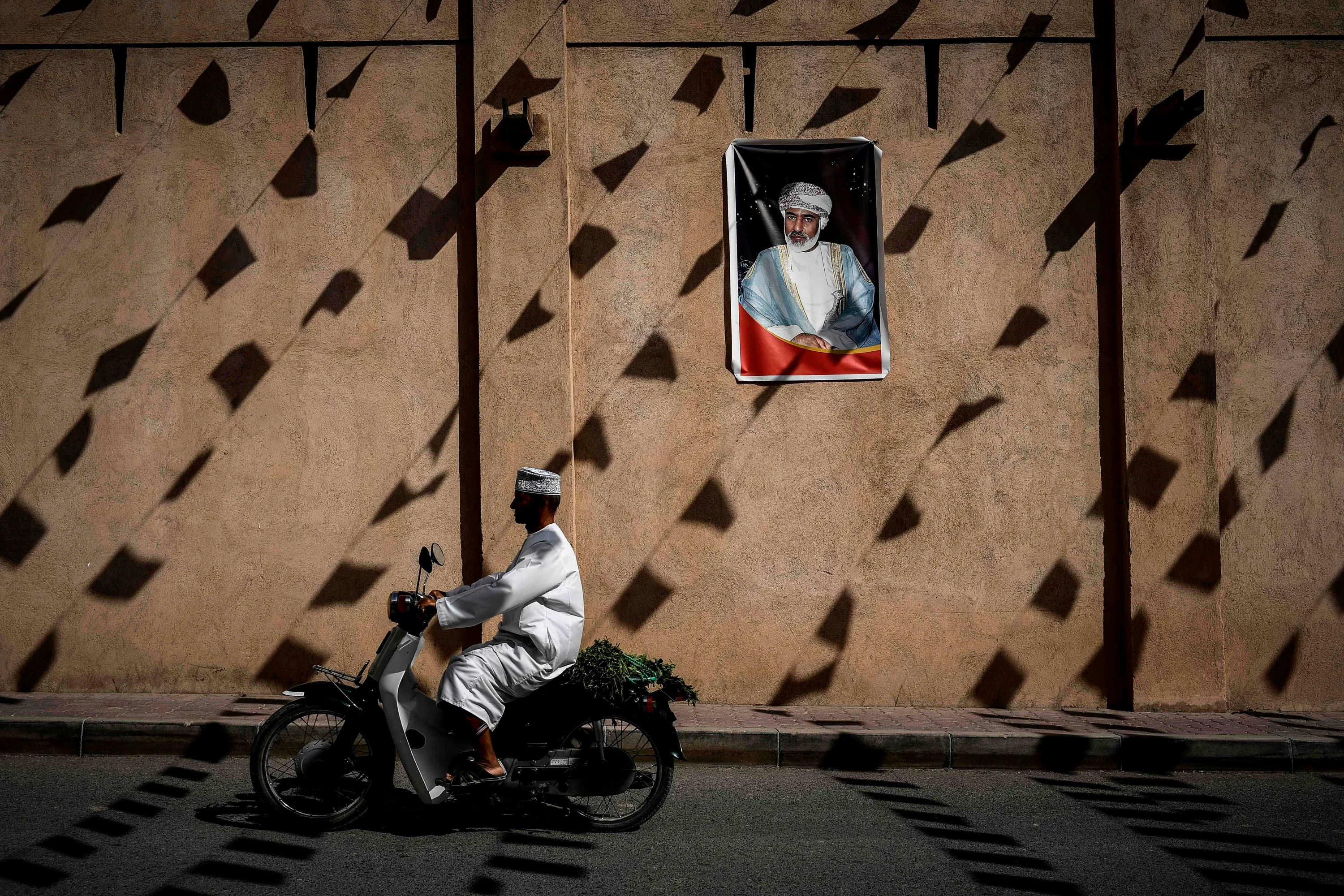 A man rides a motorcycle past a wall of the Nizwa fort bearing a portrait of the Omani Sultan before the first stage of the 2018 cycling Tour of Oman from Nizwa to the Sultan Qaboos University in Muscat on February 13, 2017. (Photo by Philippe Lopez/AFP Photo)