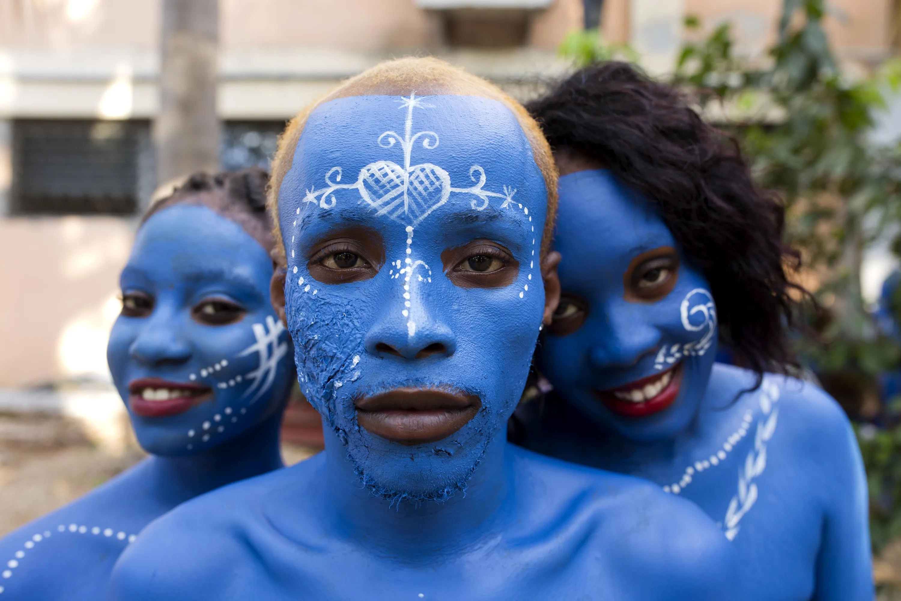 Performers in costume pose for a picture before the start of a Carnival parade in Port-au-Prince, Haiti, Tuesday, February 13, 2018. (Photo by Dieu Nalio Chery/AP Photo)