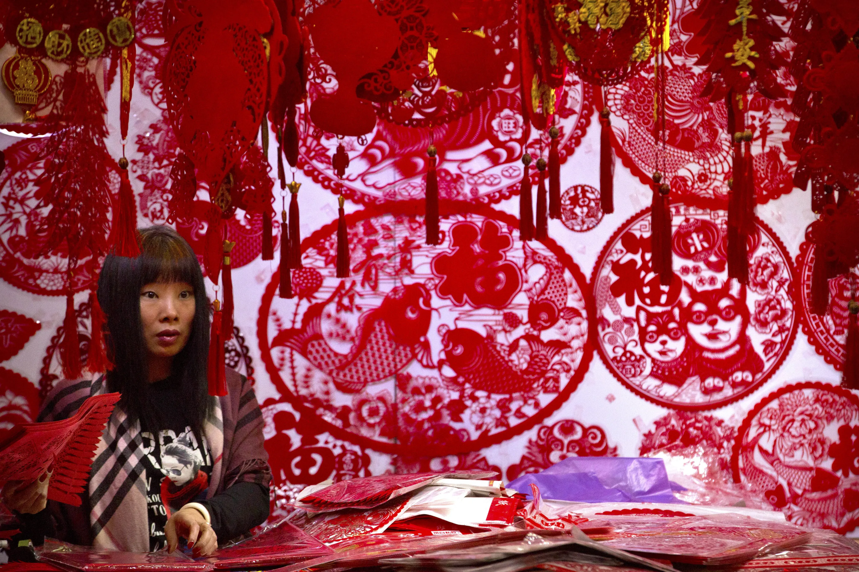 In this Tuesday, February 13, 2018, file photo, a vendor selling Lunar New Year decorations waits for customers at a wholesale market in Beijing. (Photo by Mark Schiefelbein/AP Photo)