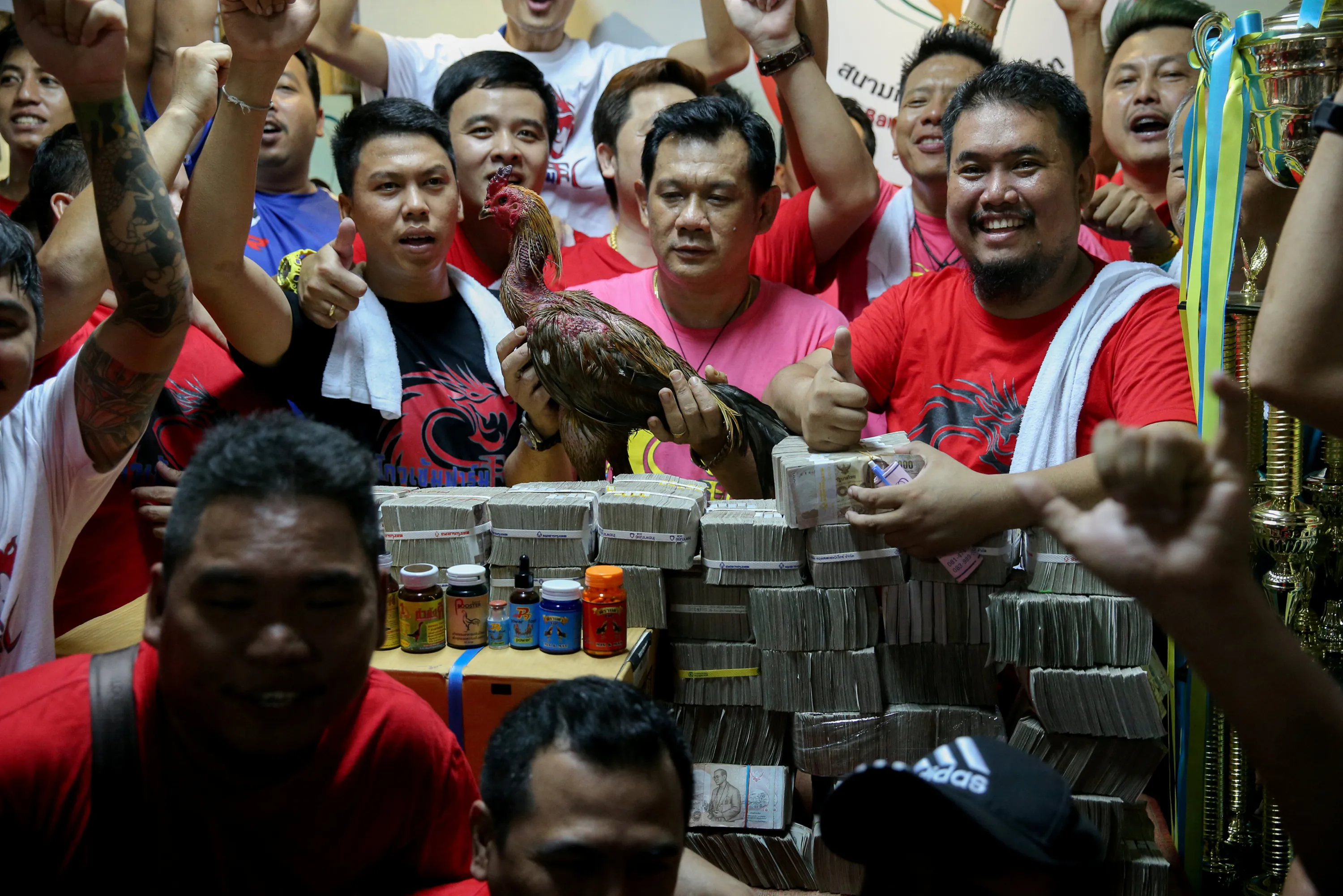 The owner of the winner rooster and his team pose after winning a cockfighting match with the highest cash reward of cockfighting in Thai history for more than one million USD at a stadium on the outskirts of Bangkok, Thailand, February 18, 2018. (Photo by Athit Perawongmetha/Reuters)