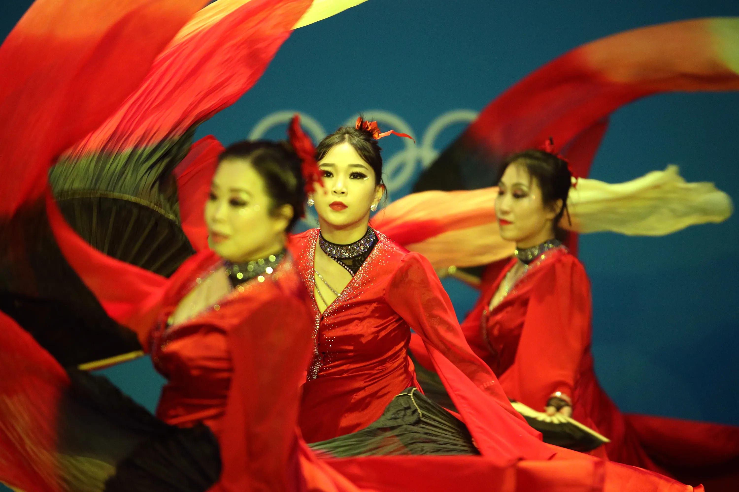 Performers dance prior to the Medal Ceremony on nine one of the PyeongChang 2018 Winter Olympic Games at Medal Plaza on February 18, 2018 in Pyeongchang-gun, South Korea. (Photo by Chris Graythen/Getty Images)