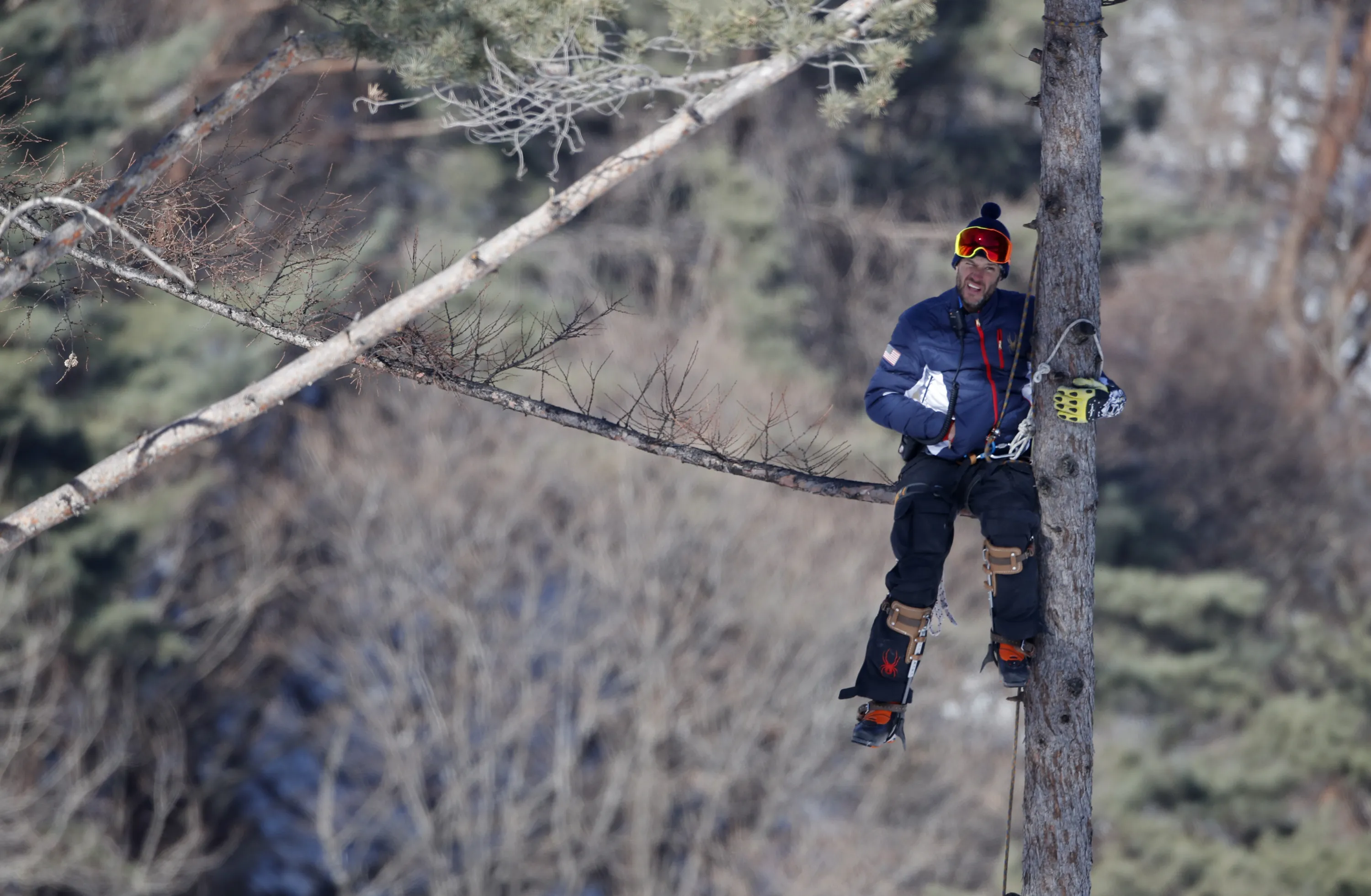 A coach from the U.S. team sits on a tree as he prepares to film the Women's Super-G February 17, 2018 at the 2018 Winter Olympics in Pyeongchang, South Korea. (Photo by Stefano Rellandini/Reuters)