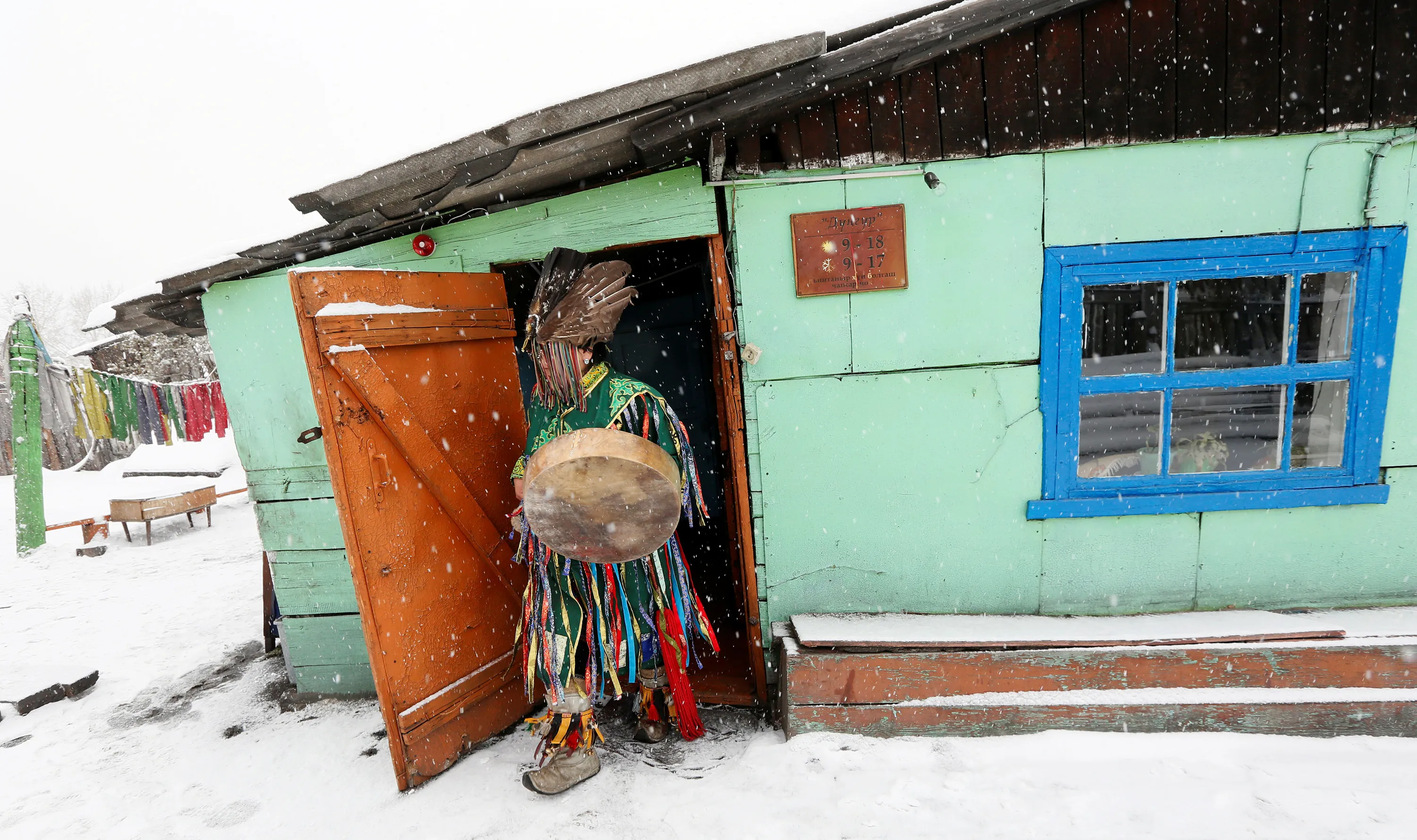 Duger Khomushku, shaman and head of the so-called Dungur society, leaves a wooden house before conducting a spiritualistic session with a customer on the exorcism of evil spirits at a courtyard of her residence in the town of Kyzyl, the administrative centre of the Republic of Tuva (Tyva region) in Southern Siberia, Russia November 3, 2016. The region is inhabited by Tuvans, historically cattle-herding nomads, who nowadays practise two main confessions – Buddhism and Shamanism. (Photo by Ilya Naymushin/Reuters)