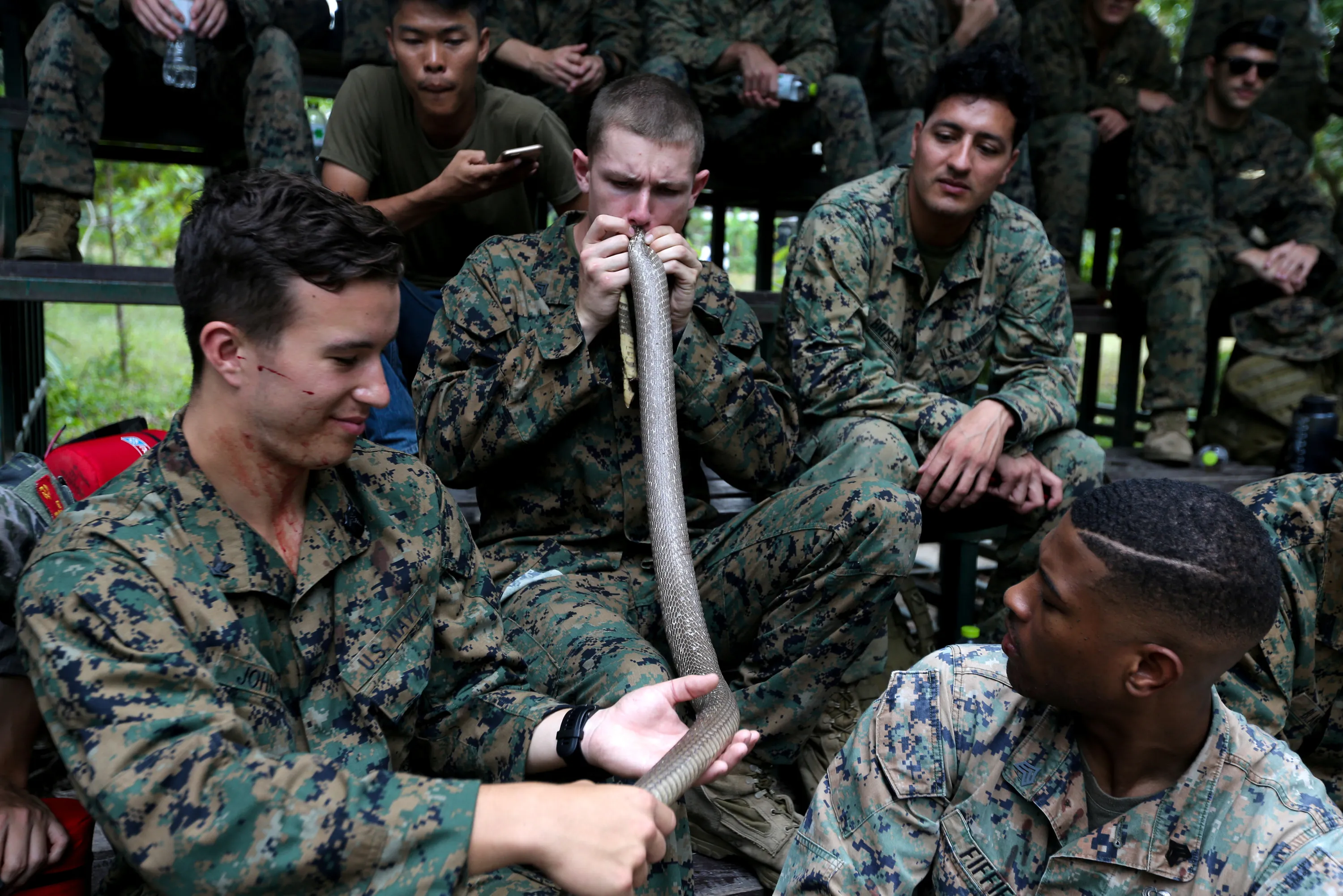 A U.S. Marine inflates a cobra skin after removing its entrails during a jungle survival exercise as part of the “Cobra Gold 2018” (CG18) joint military exercise, at a military base in Chonburi province, Thailand, February 19, 2018. (Photo by Athit Perawongmetha/Reuters)
