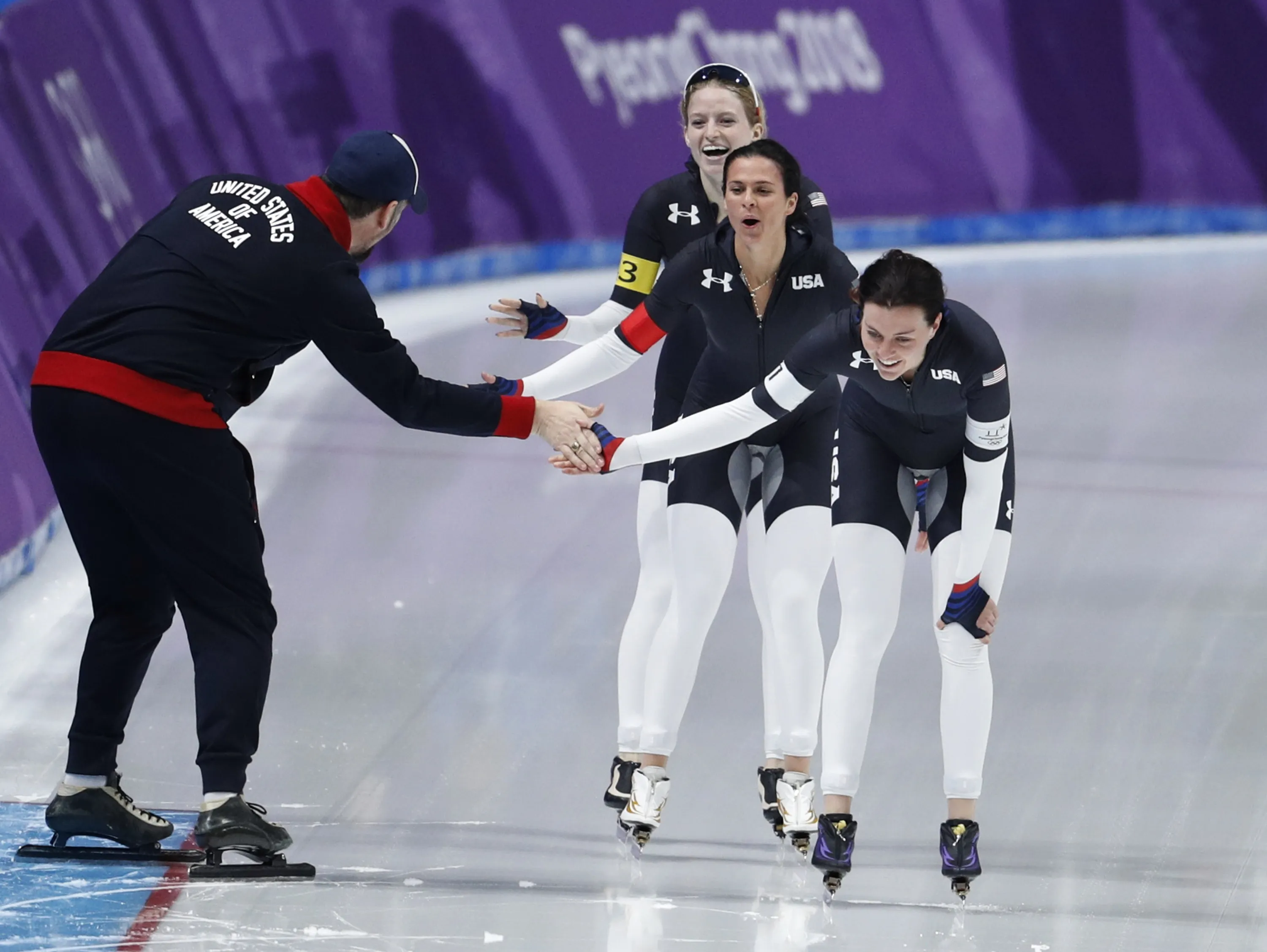 Team U.S.A. with Heather Bergsma, front, Brittany Bowe, center, and Mia Manganello, rear, celebrates with their coach after the quarterfinals of the women's team pursuit speedskating race at the Gangneung Oval at the 2018 Winter Olympics in Gangneung, South Korea, Monday, February 19, 2018. (Photo by John Locher/AP Photo)