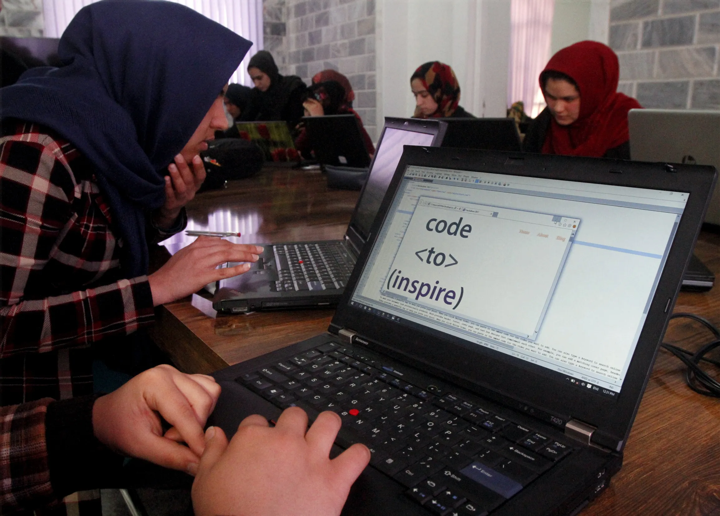 In this Sunday, January 21, 2018 photo, Afghan coders practice at the Code to Inspire computer training center in Herat province, western Afghanistan. The group of young Afghan women in the deeply conservative Herat province is breaking traditional barriers as the country’s first female coders in an overwhelmingly male-dominated field. The game they created underscores Afghanistan’s struggle to eradicate vast opium poppy fields ruled by the Taliban. (Photo by Ahmad Seir/AP Photo)