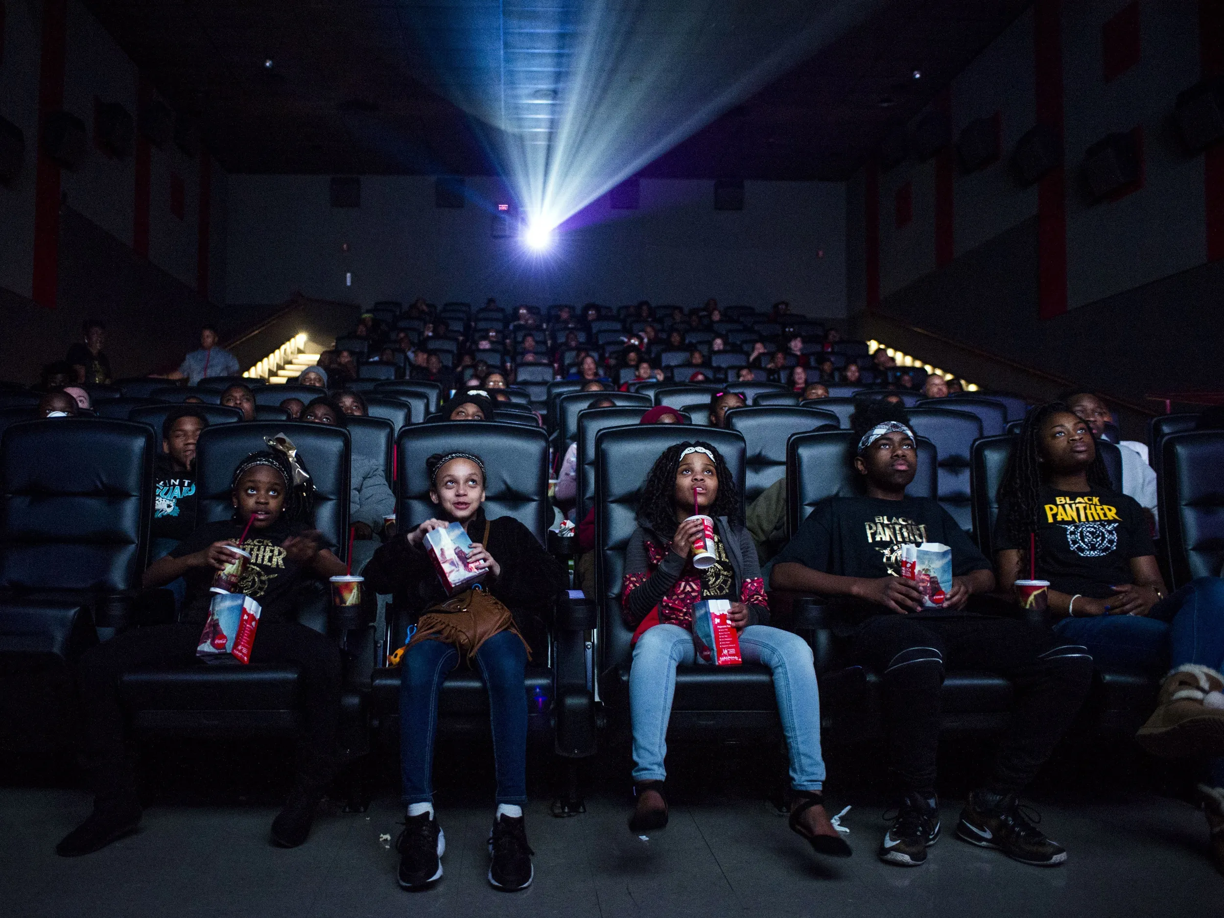 Flint resident Mari Copeny, also known as Little Miss Flint, third from left, takes a sip of her soda as she watches a free screening of the film “Black Panther” with more than 150 Flint children after she raised $16,000 to provide free tickets in an entire theater on Monday, Feb. 19, 2018 at Rave Cinemas Flint West 14 in Flint Township, Mich. Mari also gave away $2,000 in Black Panther toys and comic books at the screening. She said she is happy to see the film with her squad, pictured from left, Savannah Brown, Ayanna Johnson and Braylon Copeny. “Kids in Flint always see themselves portrayed in the media as victims. Black Panther gives Flint kids a chance to see themselves represented on the big screen as royalty and heroes”, Copeny said. “Representation across all forms of media is important, especially in media that children consume”, Copeny said. “You can be your own hero. You can be a superhero, but ultimately you're your own hero. “Black Panther” teaches us that we can be whoever you want to be. And that especially goes for Flint kids”. (Photo by Jake May /The Flint Journal-MLive.com via AP Photo)