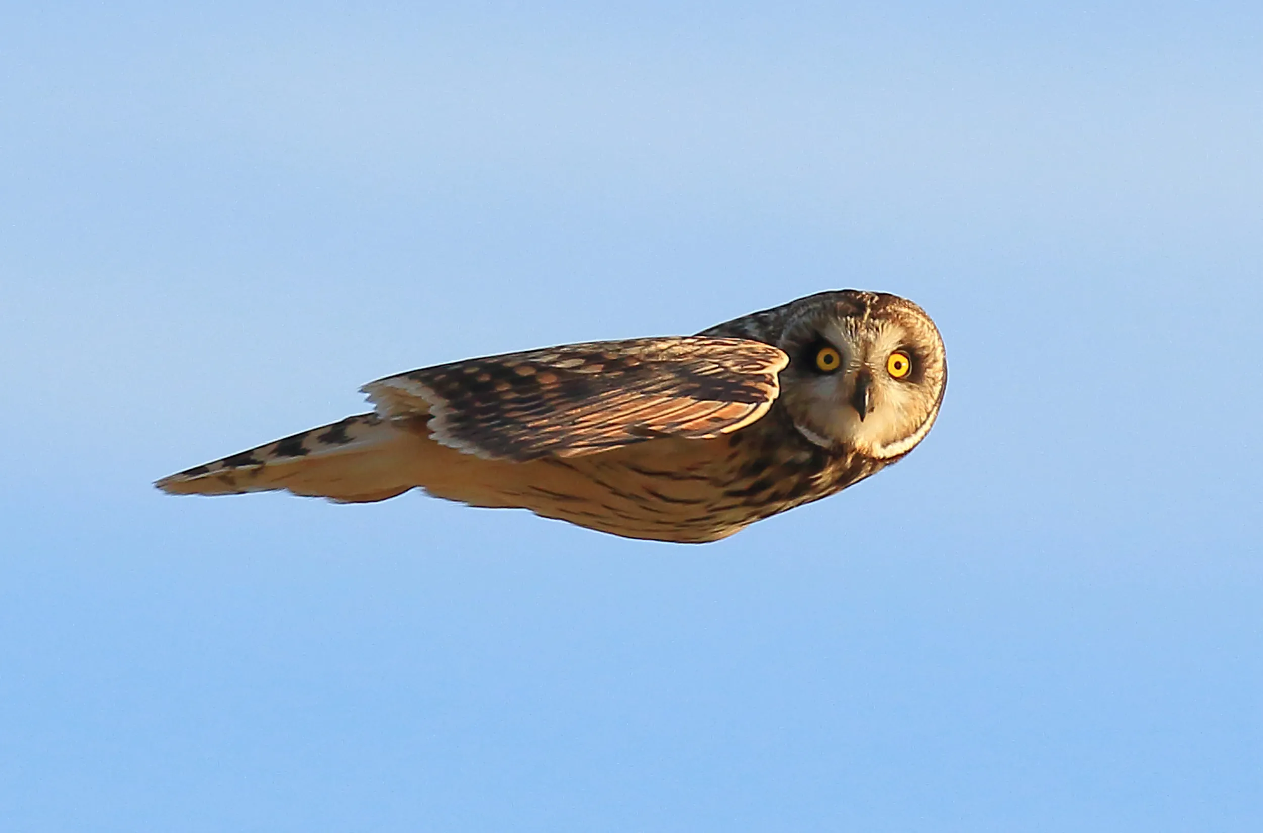 A Short-Eared Owl caught in flight in Portland, England on February 20, 2018. The bird is over-wintering on the South Coast before returning North. (Photo by Nick Dibben/Cover Images)