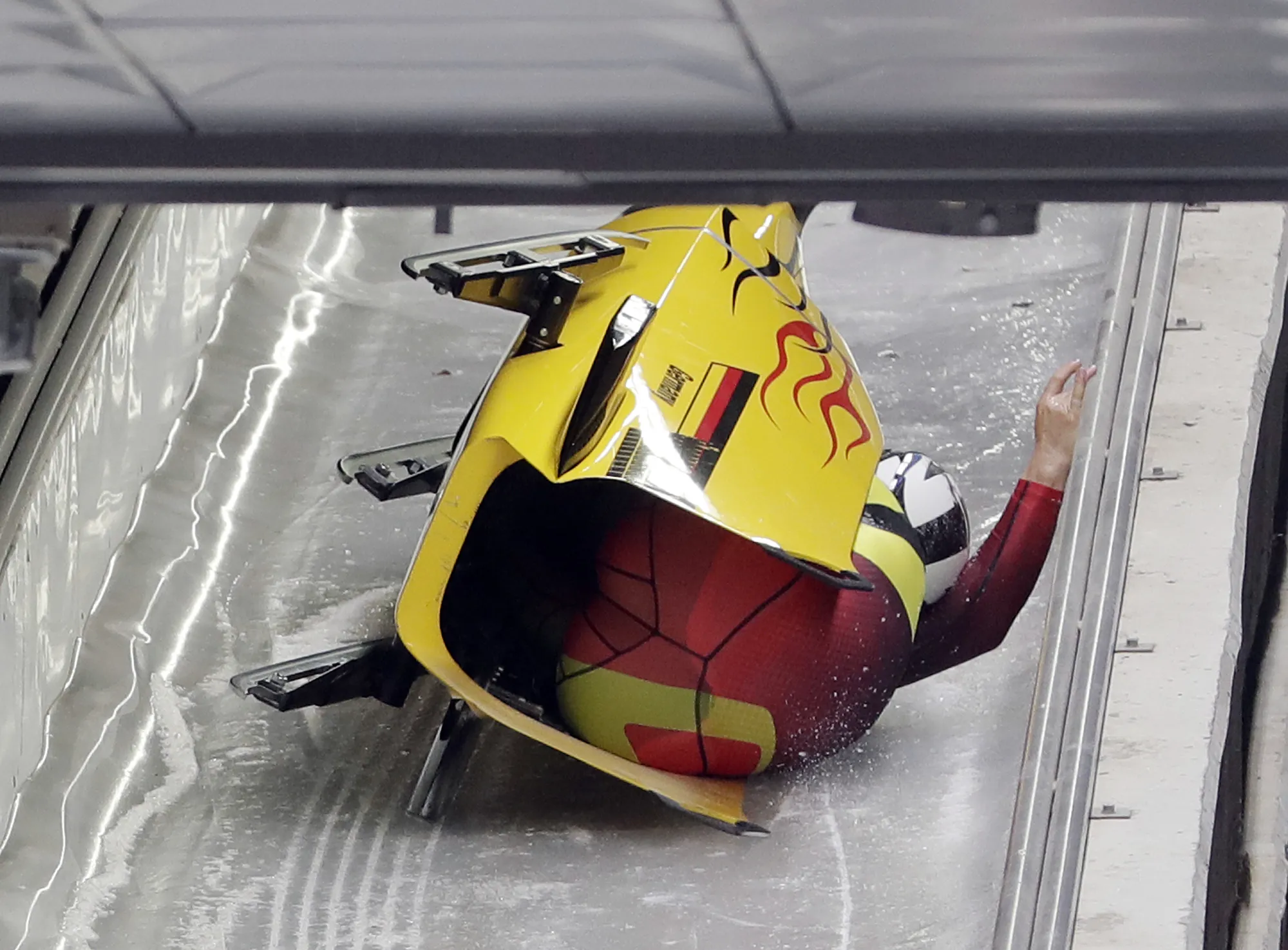 Driver Nico Walther and Christian Poser of Germany crash in the finish area after the second run during the two-man bobsled competition at the 2018 Winter Olympics in Pyeongchang, South Korea, Sunday, Februaary 18, 2018. (Photo by Michael Sohn/AP Photo)