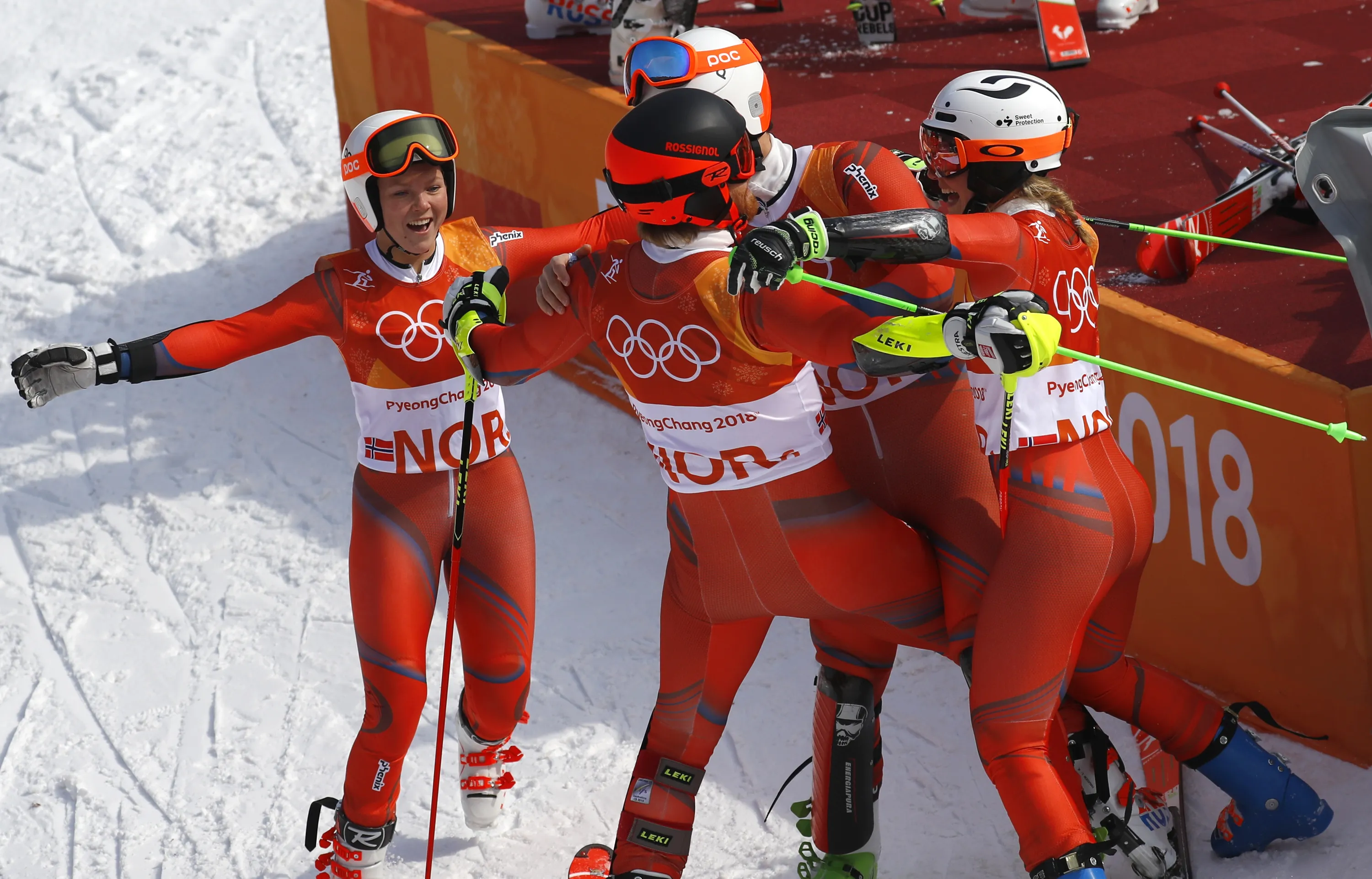 Norway' s Kristin Lysdahl, Norway' s Sebastian Foss- Solevaag, Norway' s Nina Haver- Loeseth and Norway' s Leif Kristian Nestvold- Haugen celebrate after winning the Alpine Skiing Team Event small final at the Jeongseon Alpine Center during the Pyeongchang 2018 Winter Olympic Games in Pyeongchang on February 24, 2018. (Photo by Leonhard Foeger/Reuters)