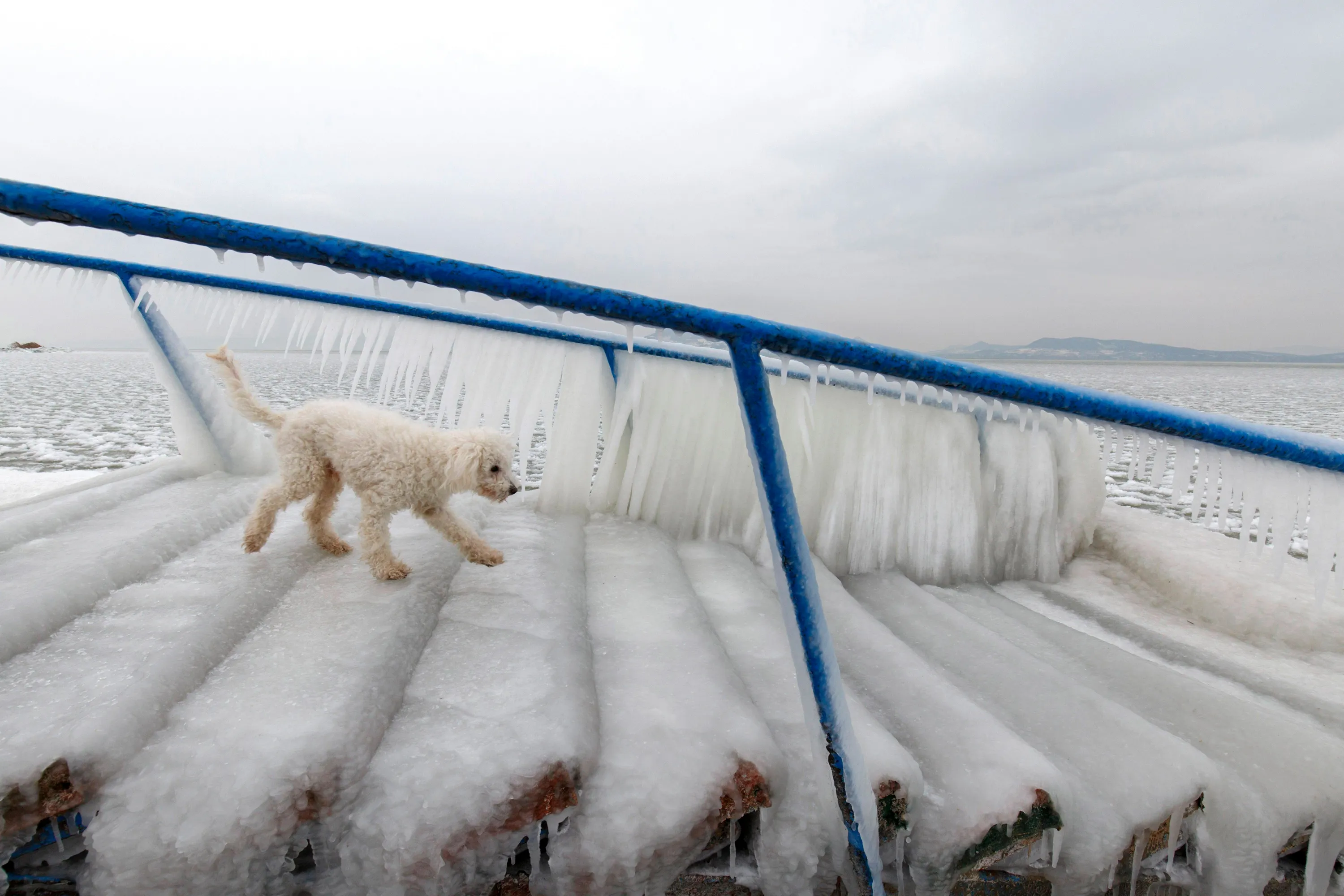 A dog walks on ice covering a stair normally used by bathers to enter and leave the water on the shore of Lake Balaton in Fonyod, 148 kms southwest of Budapest, Hungary, 26 February 2018, as extreme cold strengthened by high winds chills most of Hungary. (Photo by Gyorgy Varga/EPA/EFE)