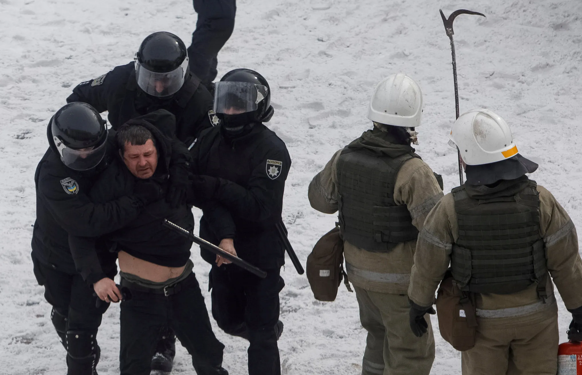 A protester is detained by riot police after clashes with supporters of Ukrainian opposition figure and Georgian former President Mikheil Saakashvili near the parliament building in Kiev, Ukraine February 27, 2018. (Photo by Alex Kuzmin/Reuters)