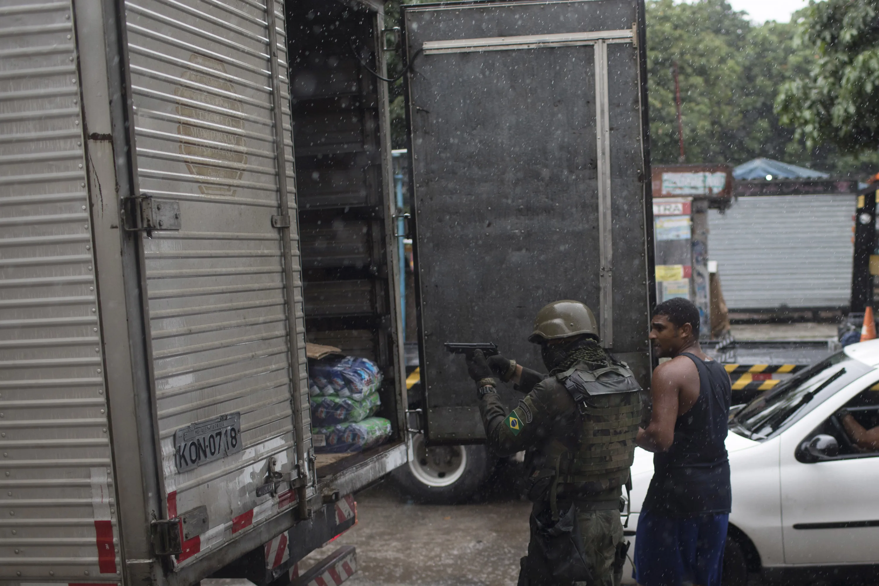 In this Friday, February 23, 2018 photo, a soldier takes position as a driver opens the back of his trailer during a spot inspection at a checkpoint at the Vila Kennedy slum in Rio de Janeiro, Brazil. Similar to previous troop deployments in Rio, soldiers have had a secondary role, setting up checkpoints and perimeters but not leading attempts to arrest armed traffickers. (Photo by Leo Correa/AP Photo)