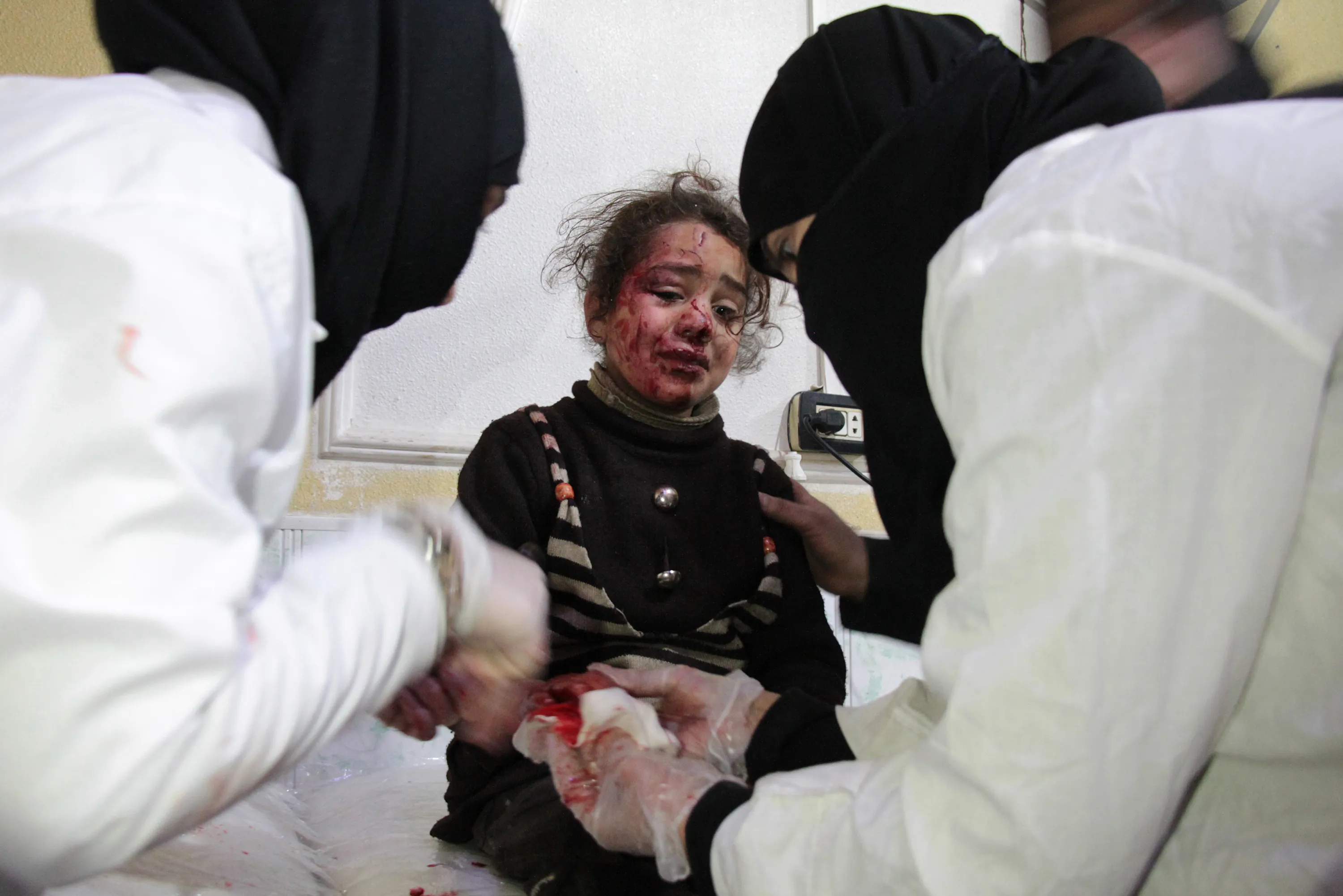 A Syrian girl who was injured in bombardment cries as she receives treatment at a make-shift hospital in the besieged rebel-held town of Douma, on the outskirts of the capital Damascus on January 6, 2018. The deadliest of Syrian regime and Russian air strikes on the Eastern Ghouta region hit the Hammuriyeh district, leaving 12 civilians dead including two children, the Syrian Observatory for Human Rights said. (Photo by Hamza Al-Ajweh/AFP Photo)