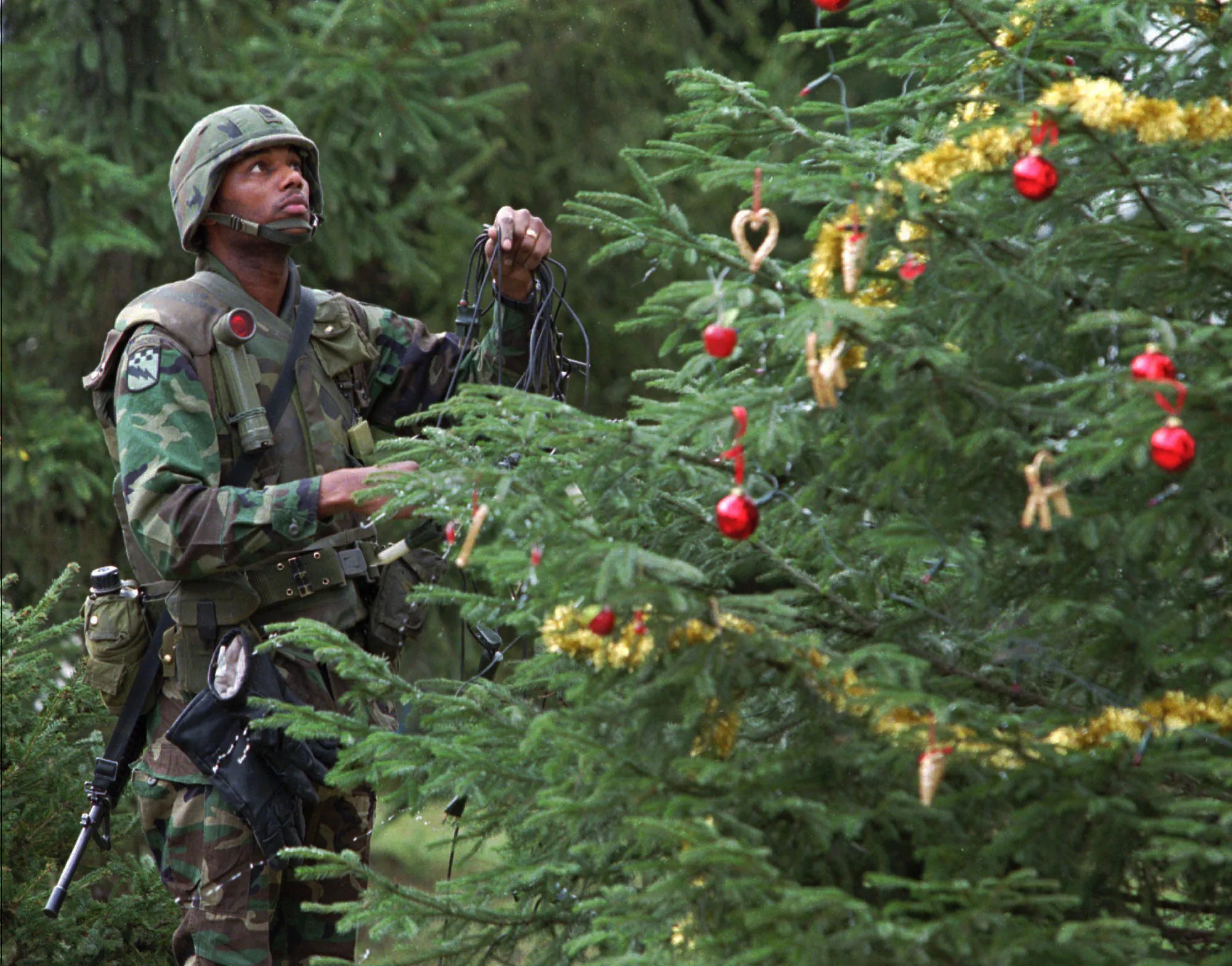 U.S. Army Sgt. Eugene Davis from Philadelphia, Pa. hangs lights on a Christmas tree Saturday, December 23, 1995 at the Tuzla Airbase in Bosnia. (Photo by Ruth Fremson/AP Photo)