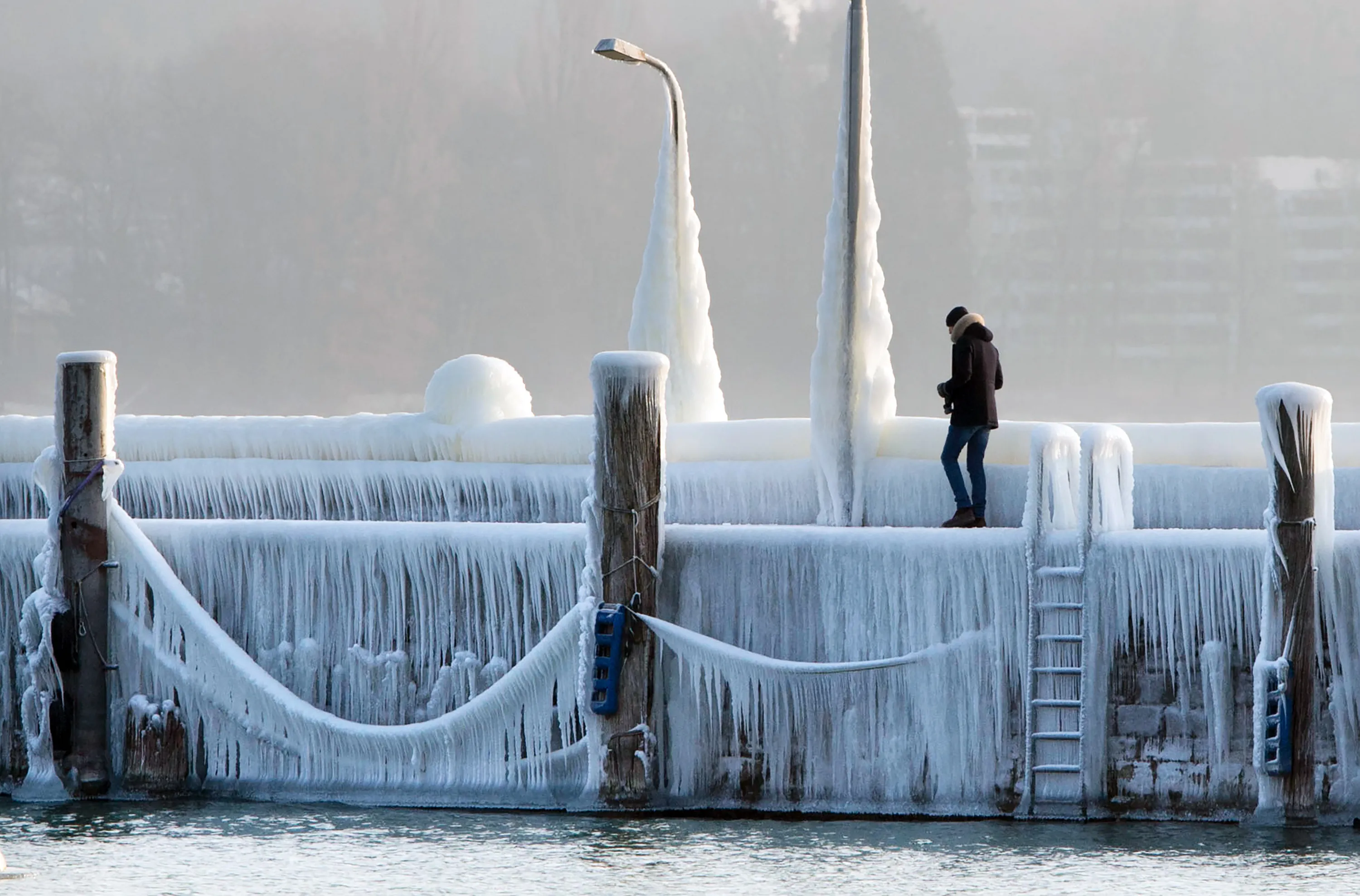 A man walks along a mole covered with ice and icicles on the Lake Constance on February 28, 2018 in Constance as a blast of Siberian weather dubbed the “Beast from the East” kept the mercury far below zero in huge parts of Europe. (Photo by Steffen Schmidt/AFP Photo/DPA)