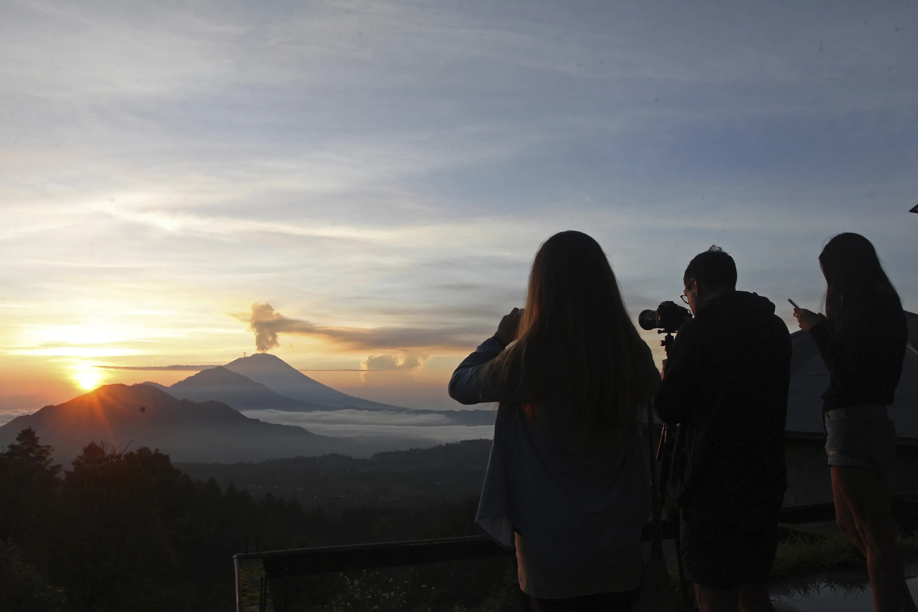 Tourists take photos of the Mount Agung volcano during a sunrise in Kintamani, Bali, Indonesia, Wednesday, December 13, 2017. Indonesia's disaster mitigation agency said the volcano remains at its highest alert level but most of Bali is safe for tourists. (Photo by Firdia Lisnawati/AP Photo)