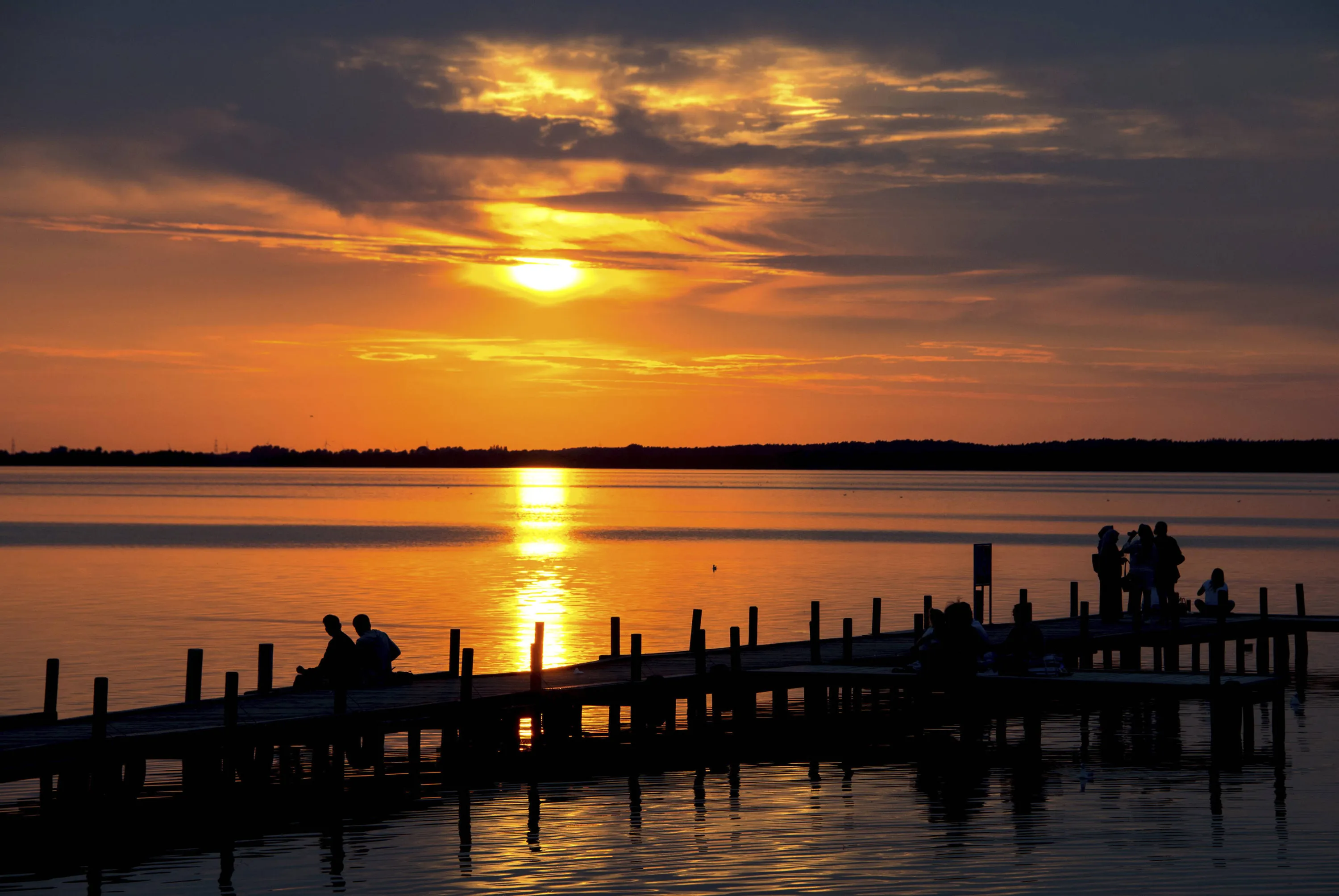 In this photo taken Wednesday, August 16, 2017, people enjoy the sunset at lake Steinhuder Meer near Steinhude, northwestern Germany. (Photo by Hauke-Christian Dittrich/DPA via AP Photo)