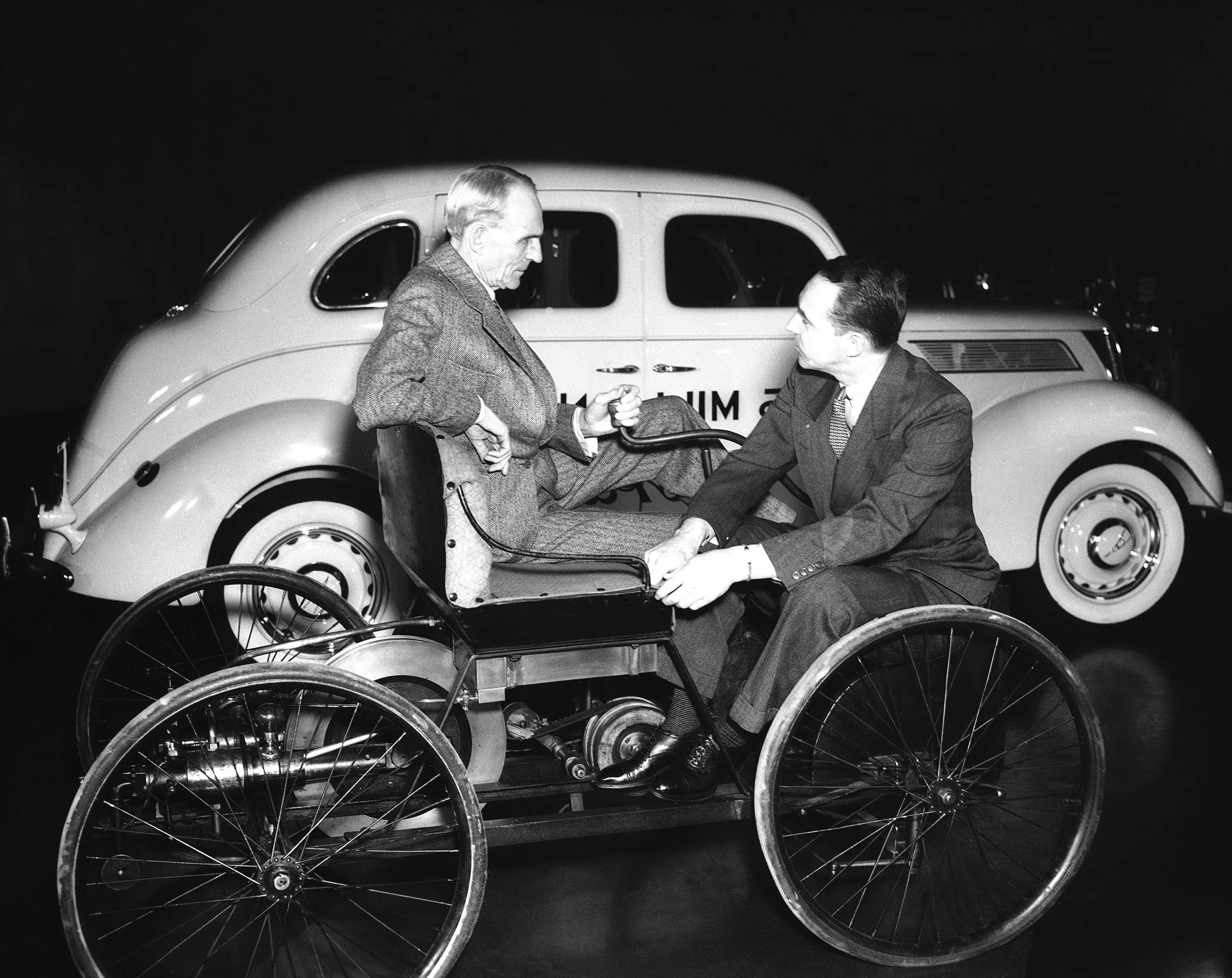 The companionship that exists between the rulers of a mighty automobile manufacture empire Henry Ford and his son, Edsel Ford. Here they are sitting on the elder Ford�s first car with the 25-millionth in the background on December 21, 1939. Note the profile resemblance the philosophy of the younger Ford, President of the entirely-family-owned two-billion-dollar concern, is of major importance to the financial and automotive worlds for it will someday determine the fiscal and industrial policies of a huge and vital segment of the world�s economic and business structure. (Photo by AP Photo)