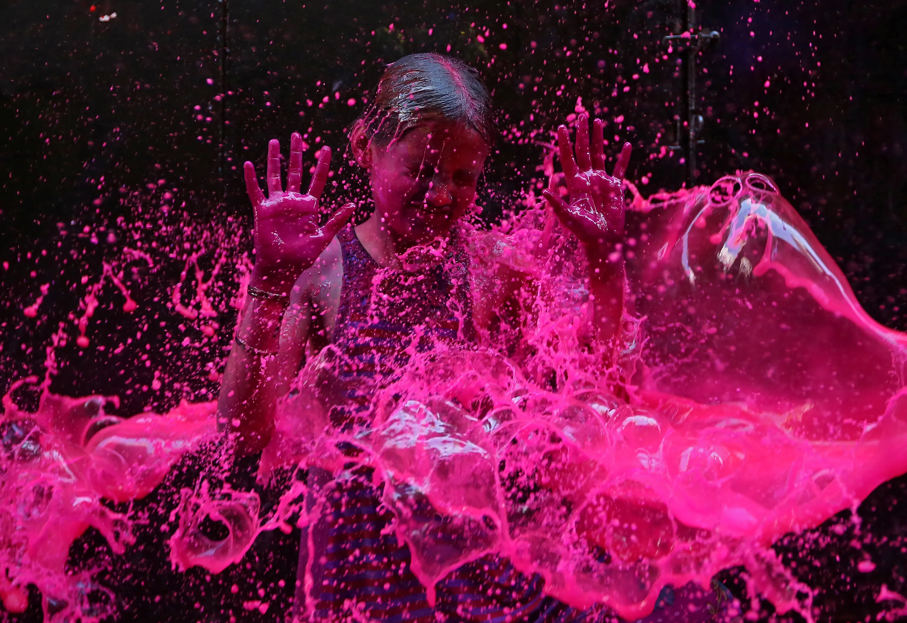 A girl reacts as she is splashed with coloured water during Holi celebrations in Chennai, India on March 2, 2018. (Photo by P. Ravikumar/Reuters)