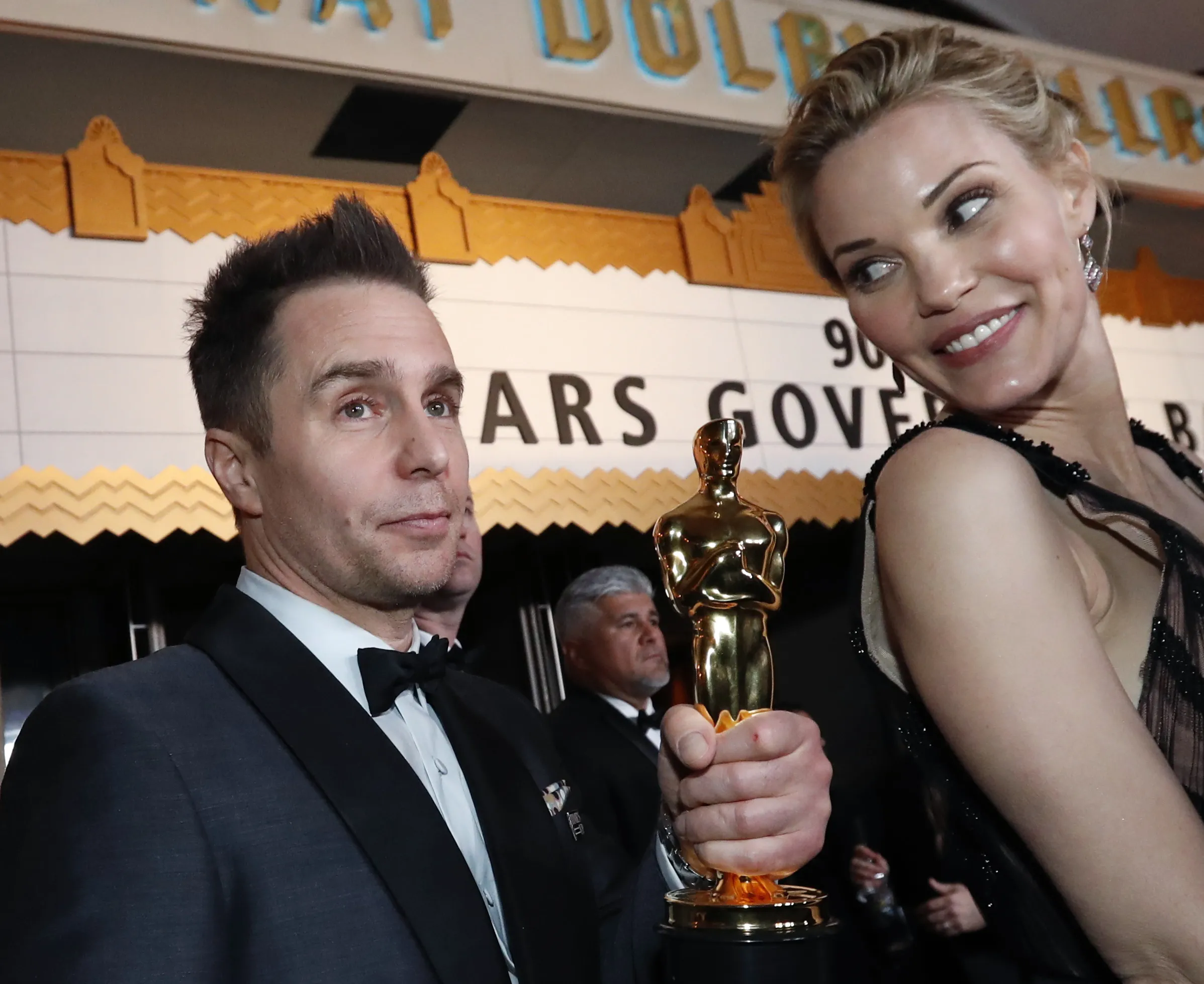Actor Sam Rockwell winner of the Best Supporting Actor award for “Three Billboards Outside Ebbing, Missouri” and Leslie Bibb attend the 90th Annual Academy Awards Governors Ball at Hollywood & Highland Center on March 4, 2018 in Hollywood, California. (Photo by Mario Anzuoni/Reuters)