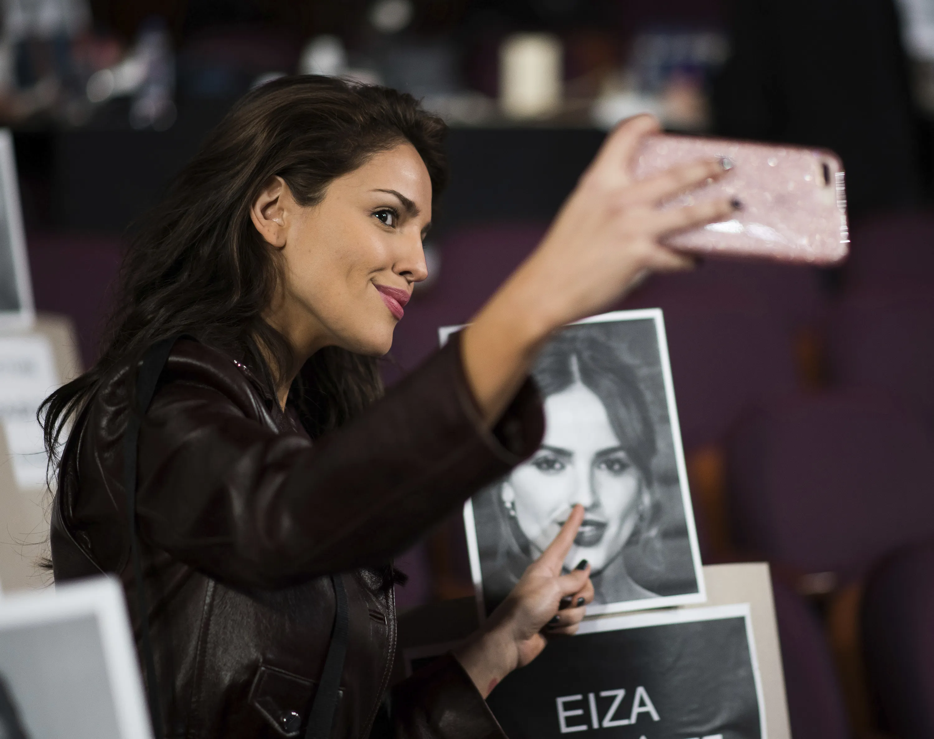 Eiza Gonzalez takes a photo with her placeholder during rehearsals for the 90th Academy Awards in Los Angeles on Saturday, March 3, 2018. The Academy Awards will be held at the Dolby Theatre on Sunday, March 4. (Photo by Charles Sykes/Invision/AP Photo)