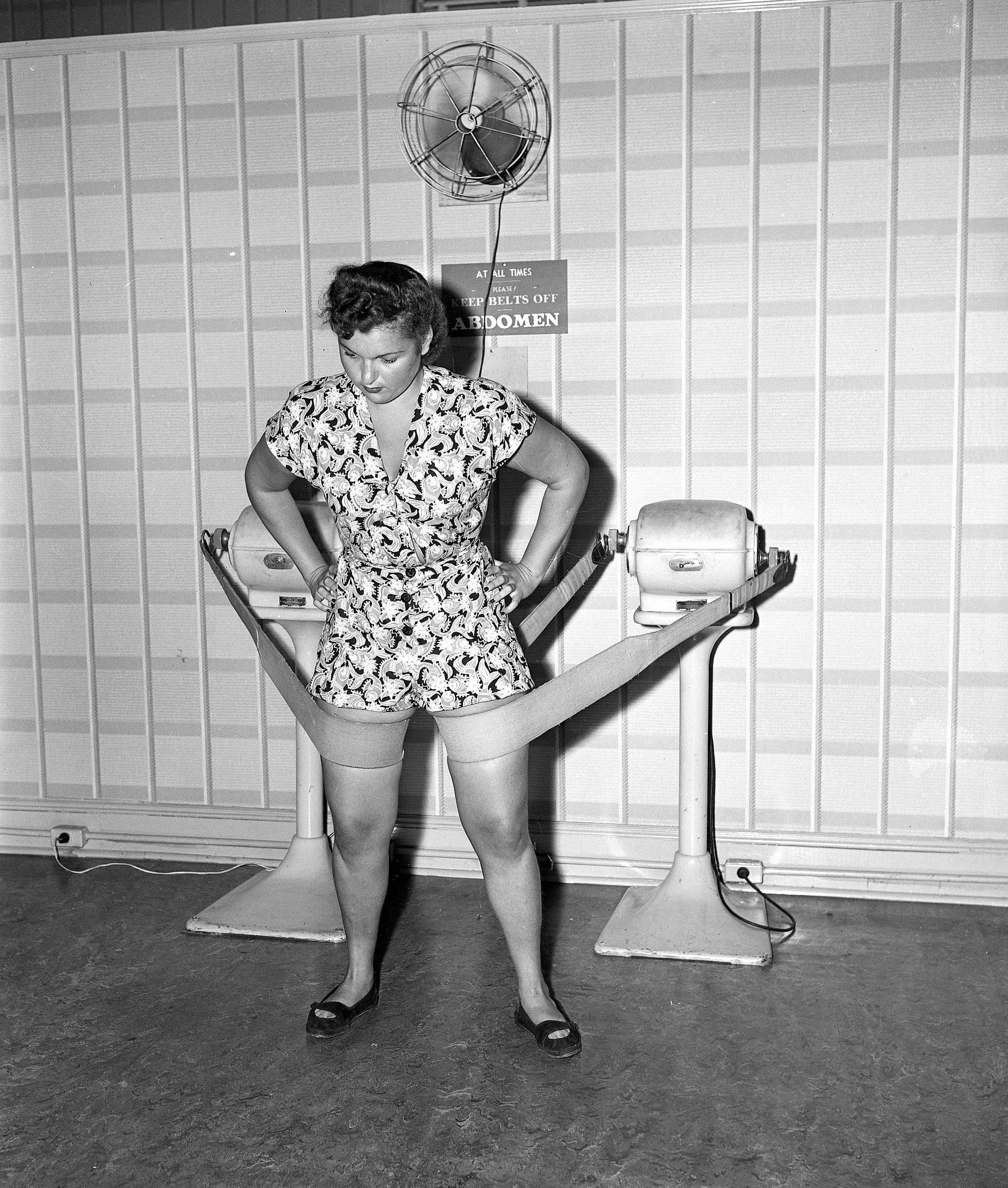 A woman demonstrates the vibratory exercise belt, which can be raised or lowered by using a T-handle, at the Mac Levy salon on November 30, 1946. (Photo by AP Photo)