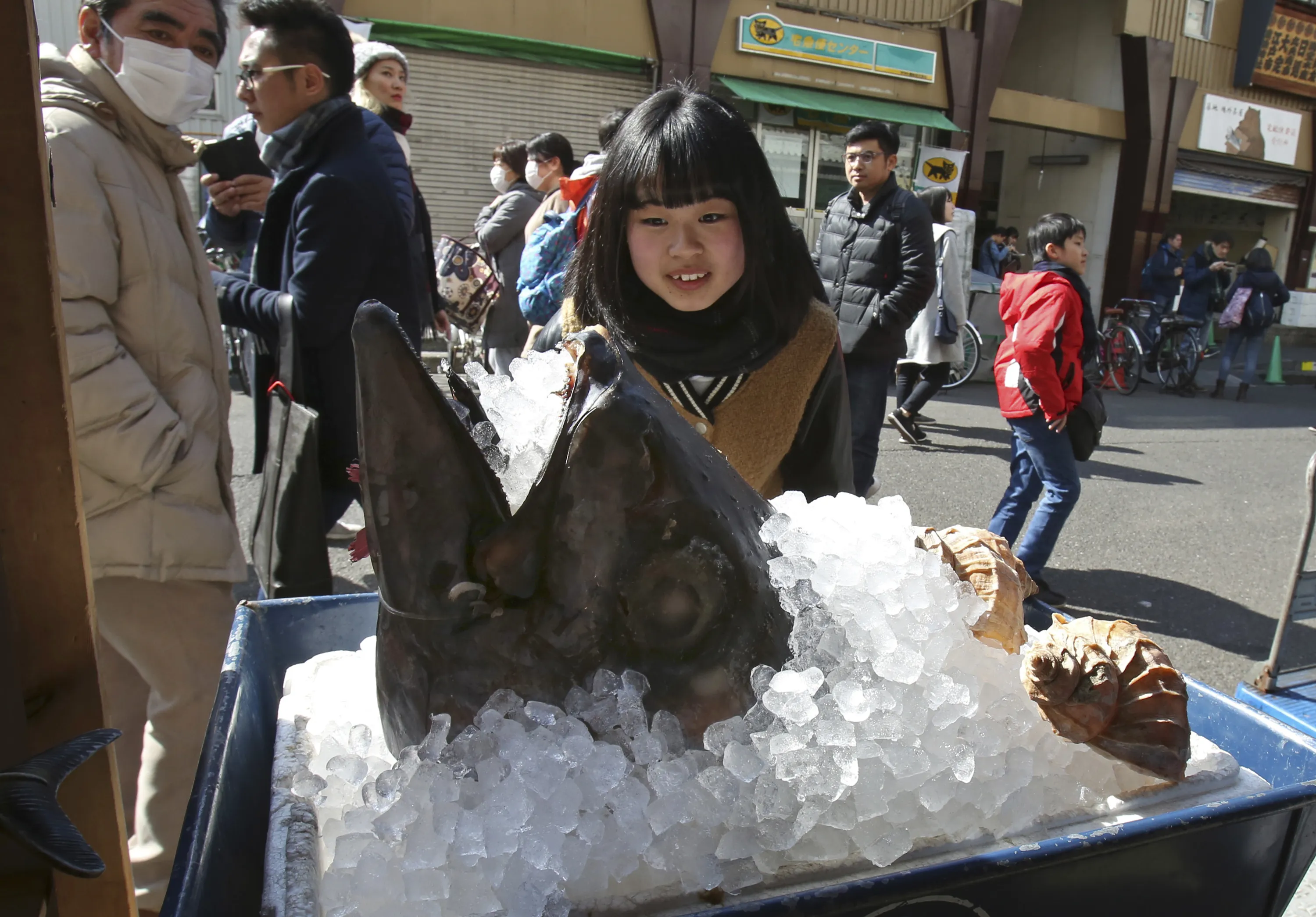 A woman looks at head of bluefin tuna on display in front of a store at Tsukiji fish market in Tokyo, Monday, February 19, 2018. The large bluefin are particularly valuable in Japan, where they are considered a premium sushi and sashimi fish. A single fish sold for more than $1.75 million at an auction in Japan in 2013. (Photo by Koji Sasahara/AP Photo)
