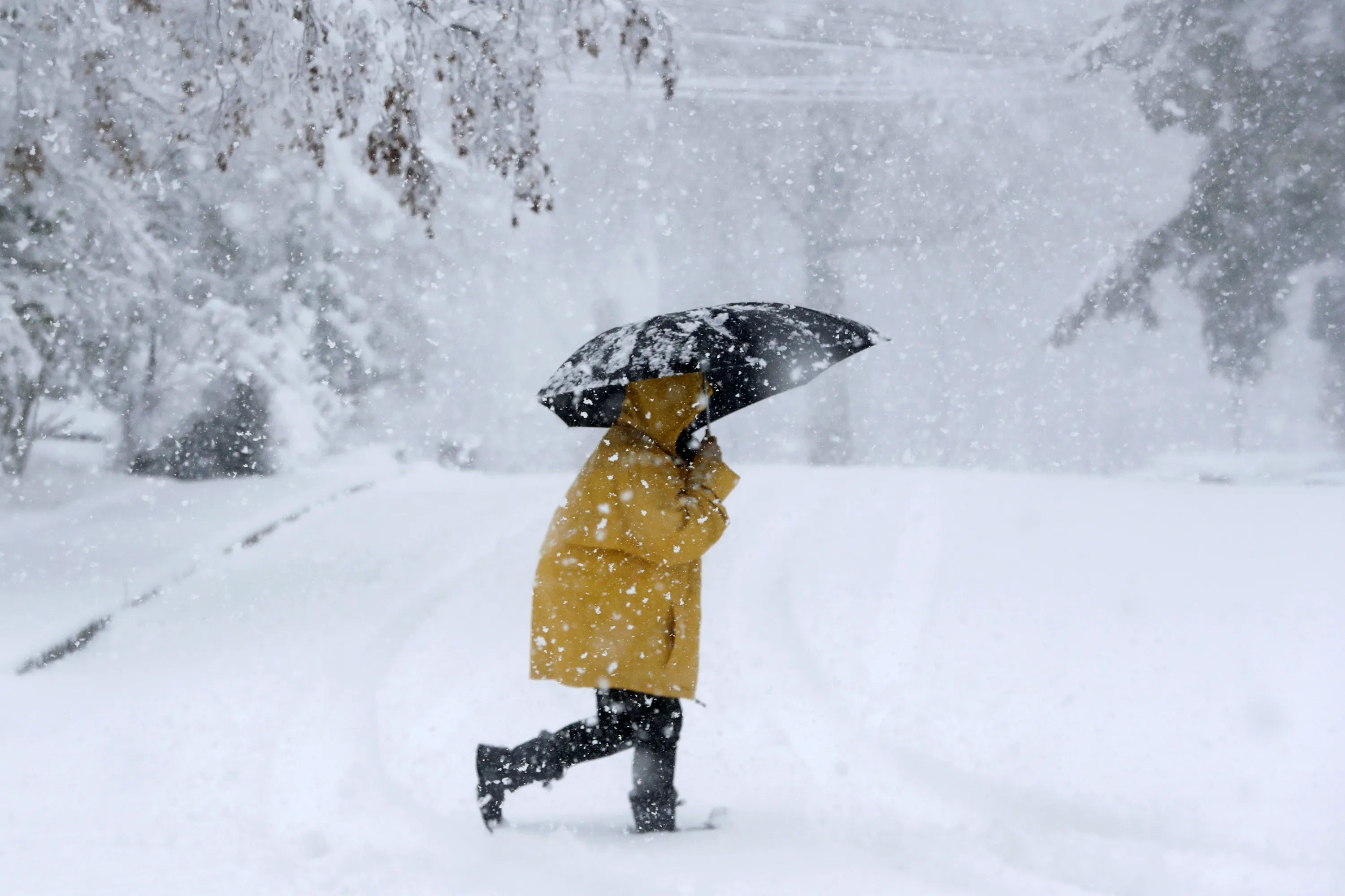A person uses an umbrella while walking during a snow storm, Wednesday, March 7, 2018, in Morristown, N.J. (Photo by Julio Cortez/AP Photo)