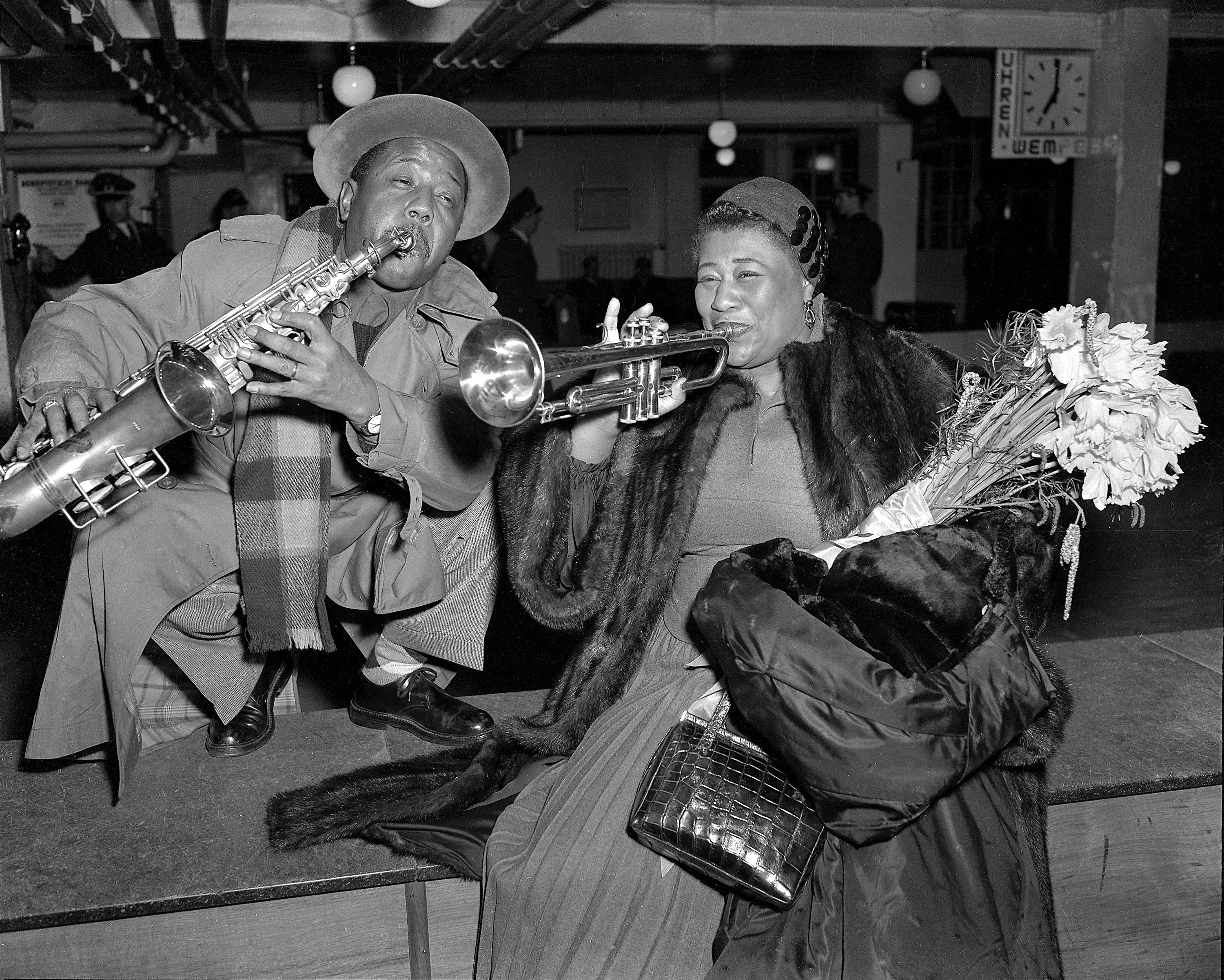 Jazz vocalist Ella Fitzgerald and trumpeter Roy Eldridge pose for photographers after arriving at the airport in Hamburg, West Germany on February 15, 1954 for a tour of Germany with other top jazz figures. They were scheduled to appear before German audiences on promoter/producer Norman Grayz' “Jazz at the Philharmonic”. (Photo by AP Photo/Brueggeman)