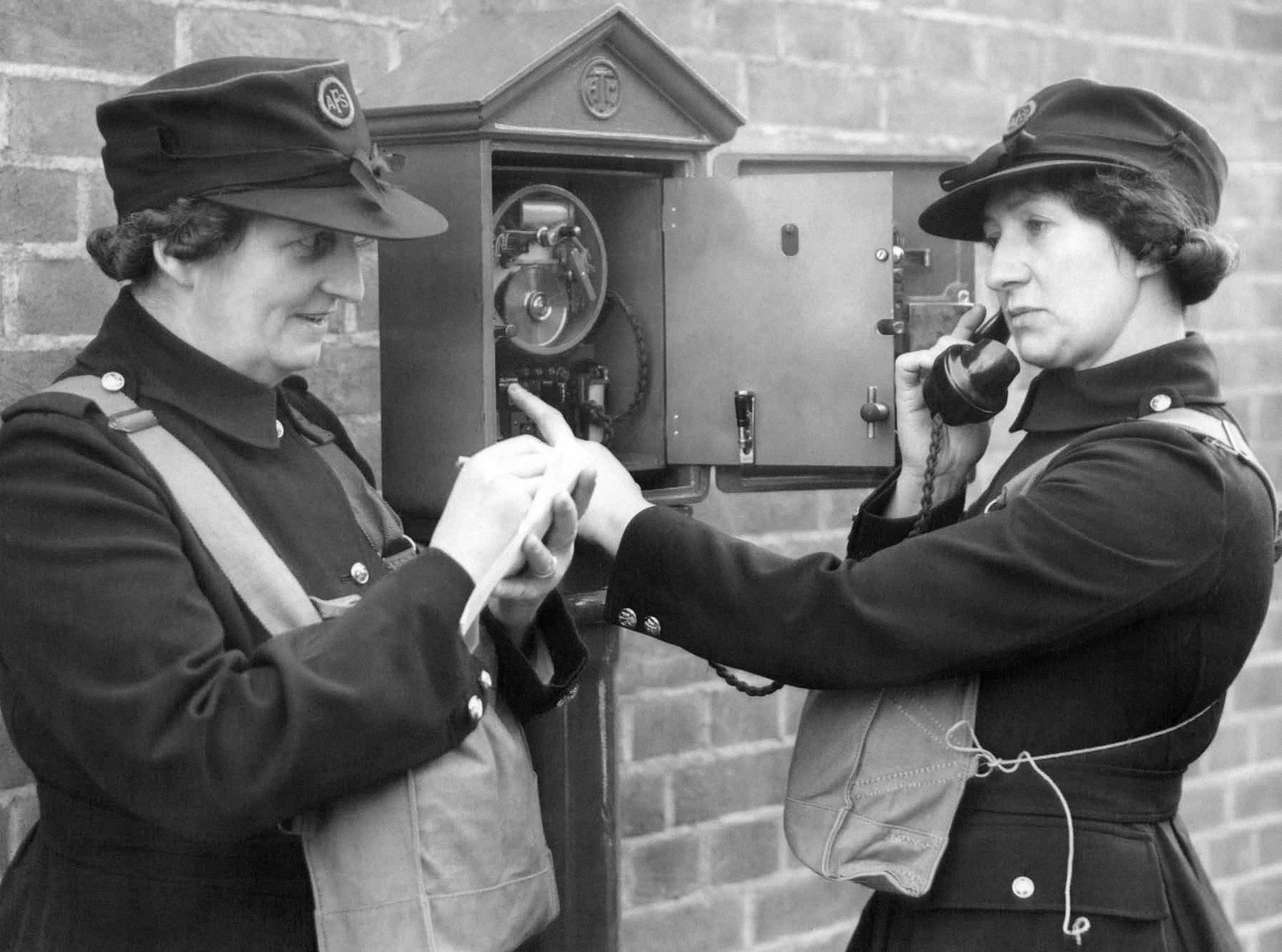 Members of the Women’s Auxiliary Fire Service, formed to assist the regular fire bridge in case of national emergency, paraded, February 23 at the London Fire Brigade headquarters, Albert Embankment. Two members of two women’s auxiliary fire service receiving an emergency call, and taking notes of instructions during their parade held at the London Fire Brigade headquarters, on February 23, 1939. (Photo by AP Photo)