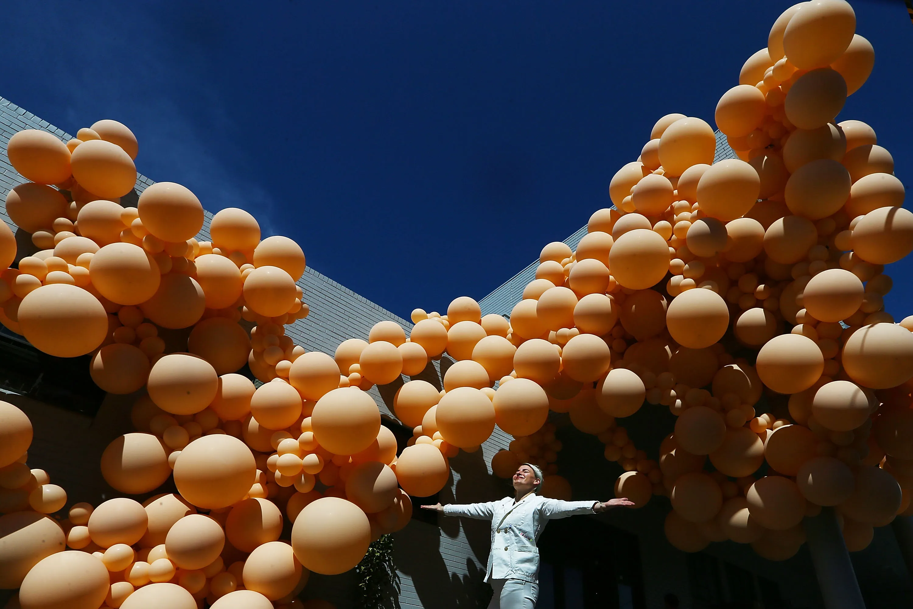 Balloon designer Jihan Zencirli, aka Geronimo, poses with her installation for Melbourne Design Week 2018 on March 14, 2018 in Melbourne, Australia. The installation is Zencirli's first ever public Australian creation, using 5000 balloons to cover the 39m facade. (Photo by Michael Dodge/Getty Images)