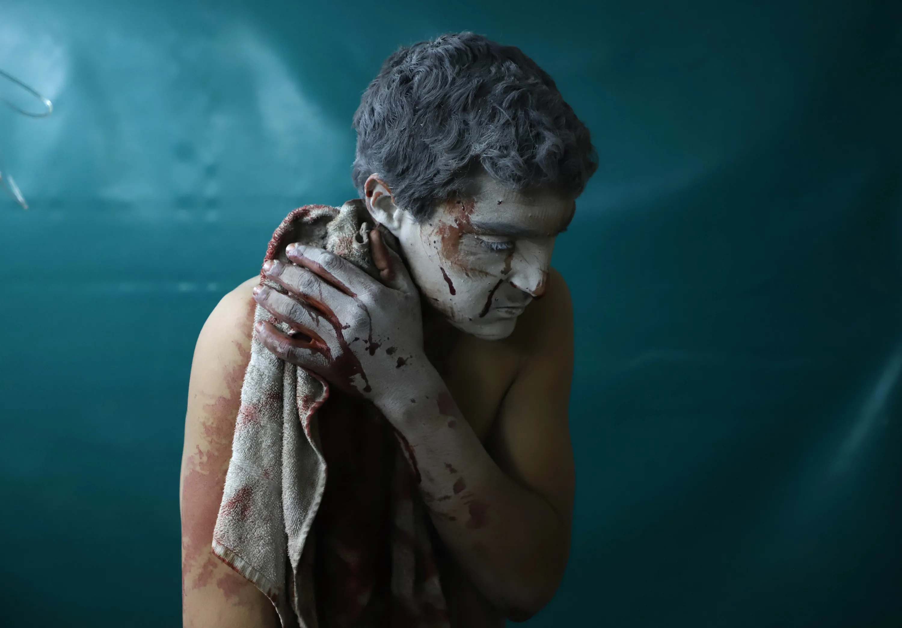 A wounded Syrian man waits for treatment at a makeshift clinic during Syrian government air strikes on Zamalka, in the rebel enclave of Eastern Ghouta on the outskirts of Damascus on March 13, 2018. More than 1,180 civilians have been killed since regime forces on February 18 launched an air and ground assault on the enclave, the Britain-based Syrian Observatory for Human Rights monitor says. Eastern Ghouta's 400,000 residents have been living under government siege since 2013, facing severe food and medecine shortages even before the latest assault. (Photo by Amer Almohibany/AFP Photo)