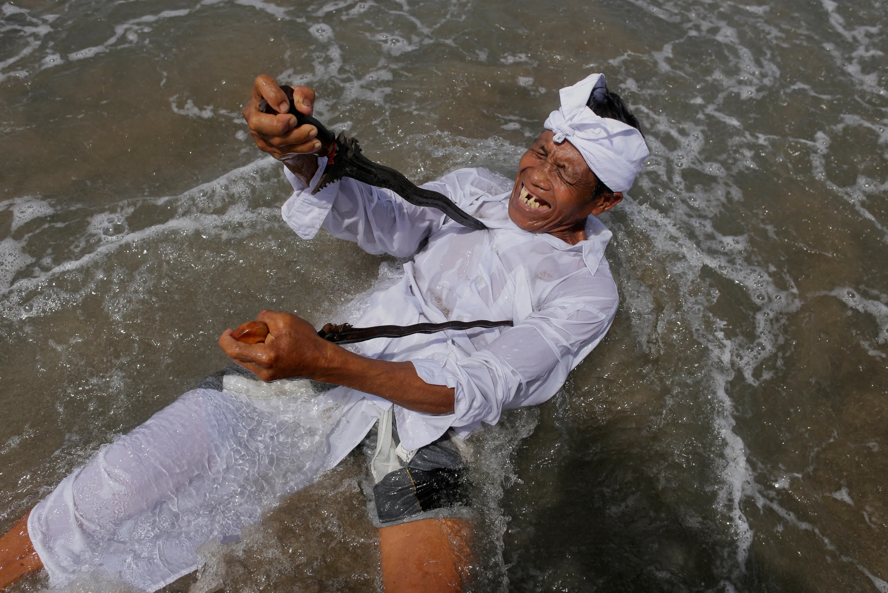 A Balinese Hindu worshiper attempts to stab himself with traditional Kris daggers while in trance during Melasti, a purification ceremony ahead of the holy day of Nyepi on a beach in Gianyar, Bali, Indonesia March 14, 2018. (Photo by Johannes P. Christo/Reuters)