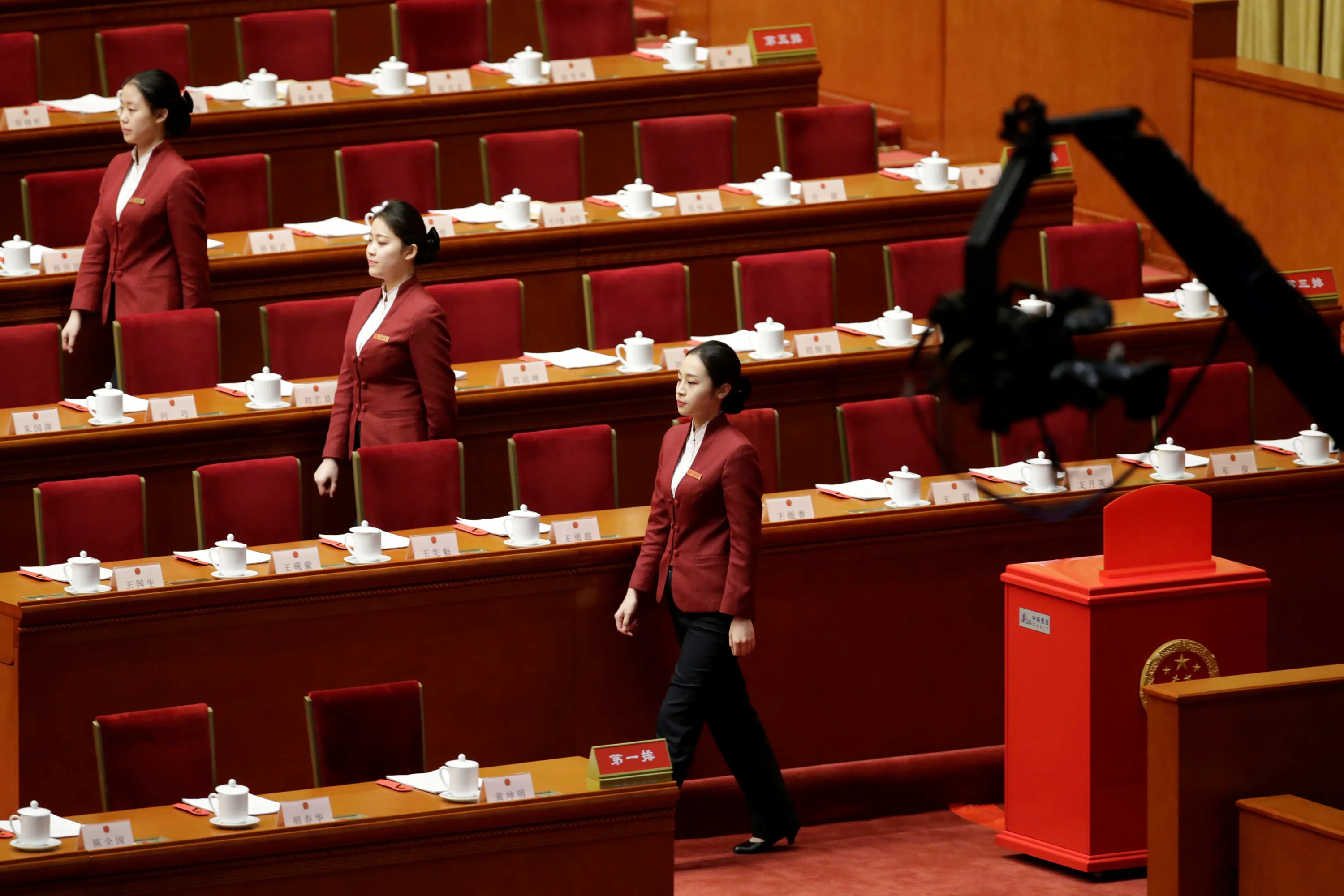 Attendants walk past a ballot box before the third plenary session of the National People's Congress (NPC), where delegates will vote on a constitutional amendment lifting presidential term limits, at the Great Hall of the People in Beijing, China March 11, 2018. (Photo by Jason Lee/Reuters)