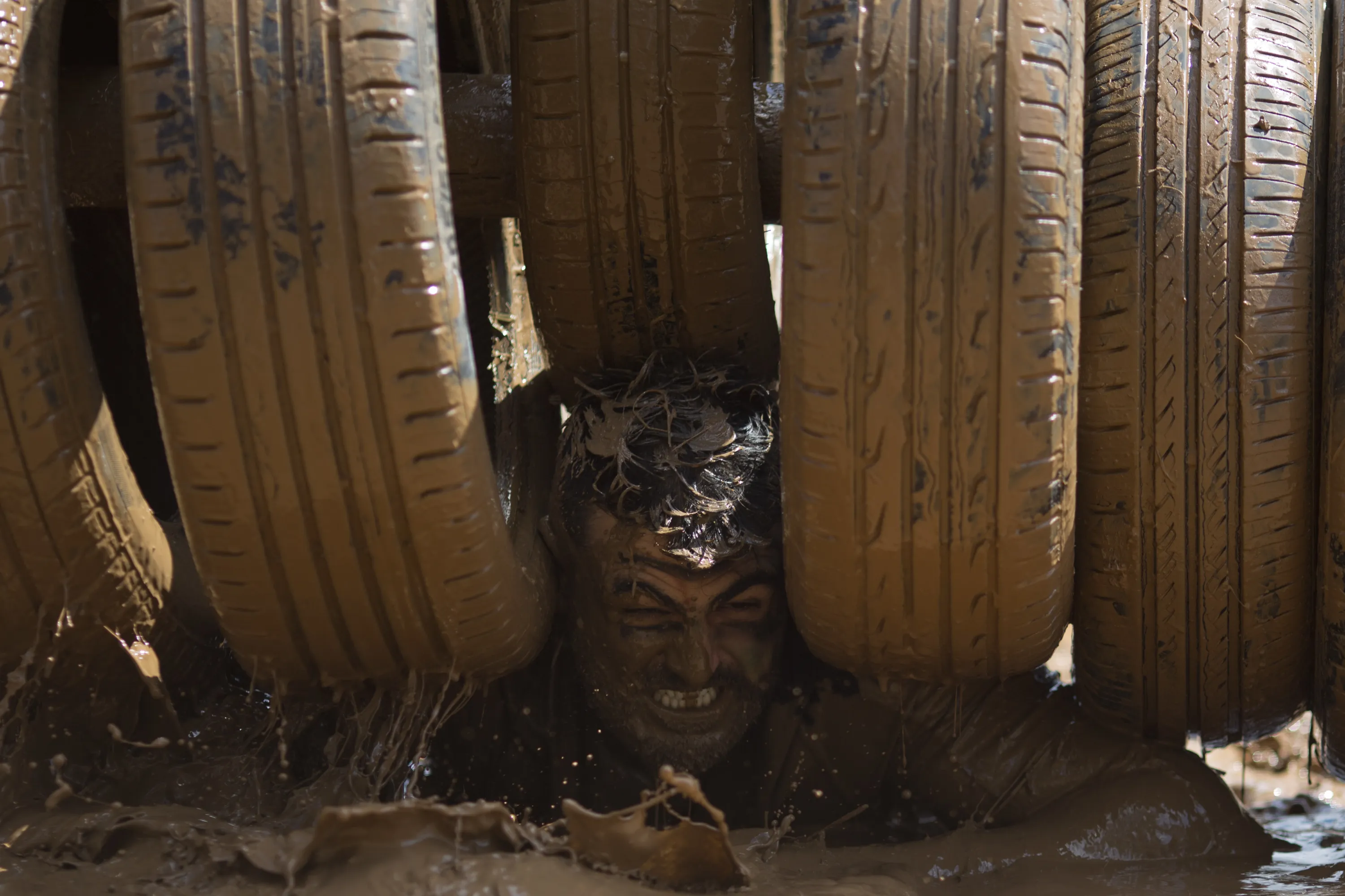 A man crawls under tires during the Mud Run, a 10 kilometers obstacle course in Tel Aviv, Israel, Friday, March 16, 2018. (Photo by Ariel Schalit/AP Photo)