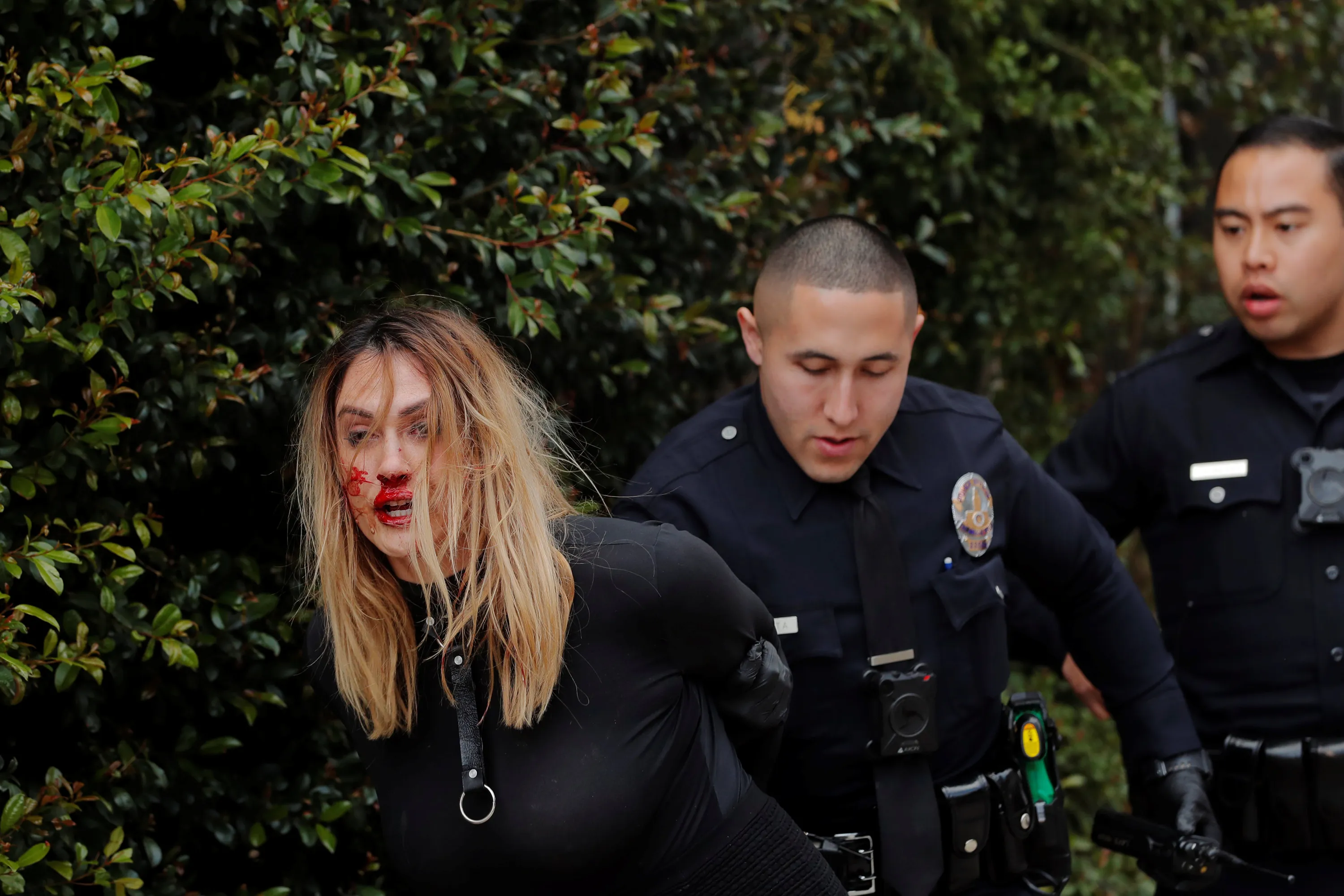 A woman with a bloody nose is detained after a scuffle by police officers outside of the Roosevelt Hotel in Hollywood, Los Angeles, California, U.S., March 3, 2018. (Photo by Lucas Jackson/Reuters)
