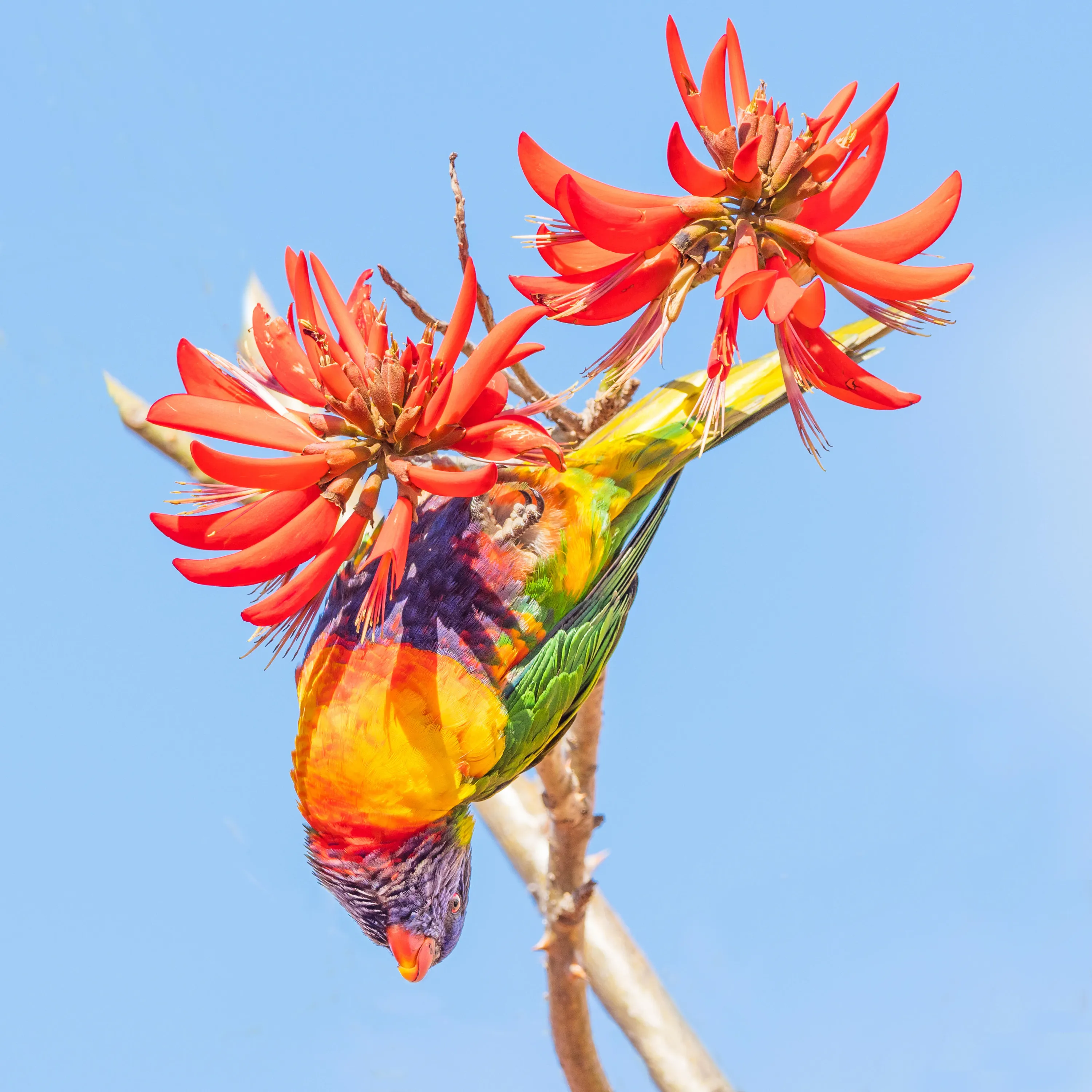 A rainbow lorikeet (Trichoglossus haematodus) – a colourful, medium-sized Australian parrot – feeds on the flowers of a coral tree. (Photo by David Steele/Alamy Stock Photo)