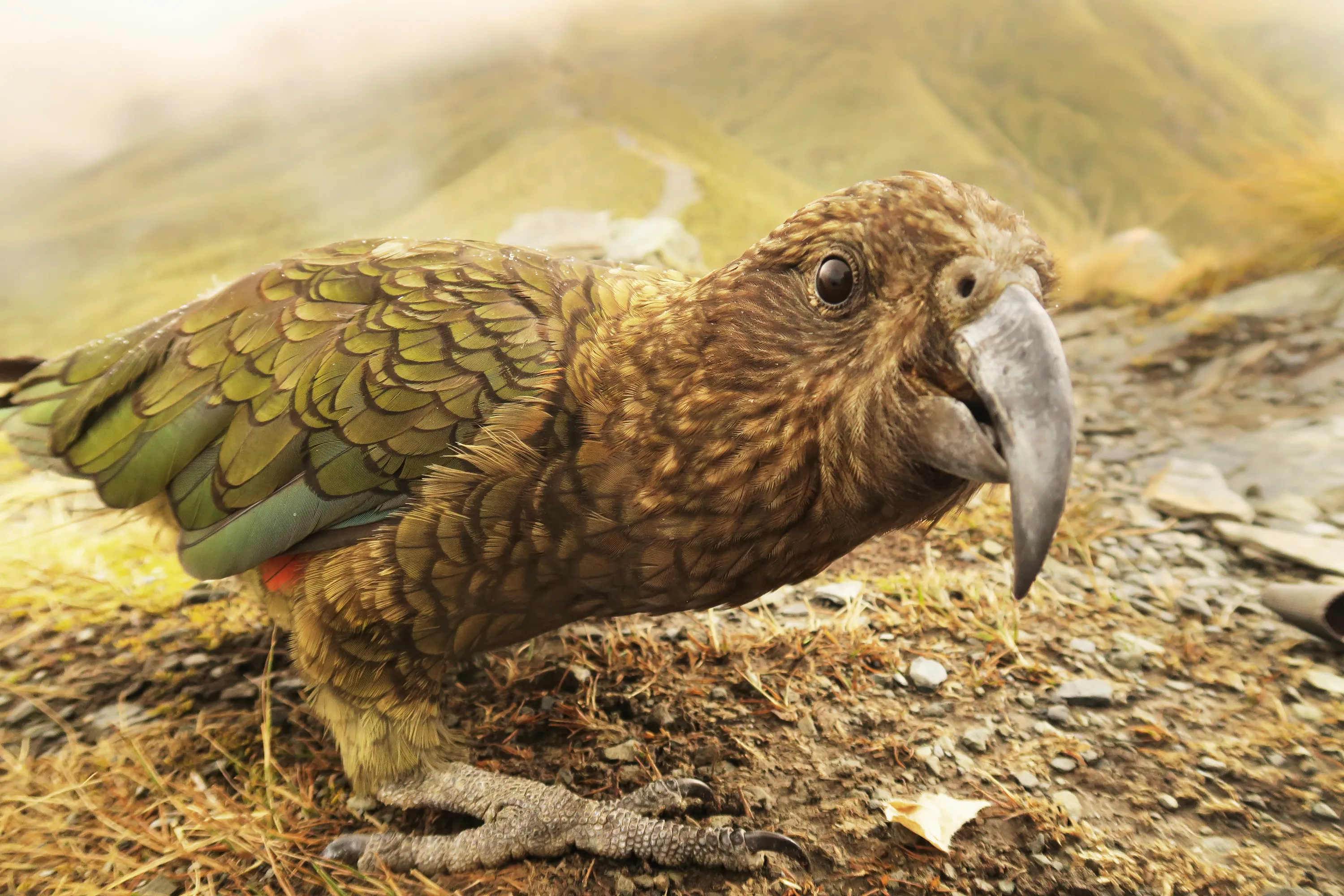 The endangered kea, captured here at the Ben Lomond Track at Queenstown in Fiordland, New Zealand, is the world’s only alpine parrot, and one of the most intelligent, if mischievous and destructive birds. (Photo by Murdo Macleod for the Guardian)