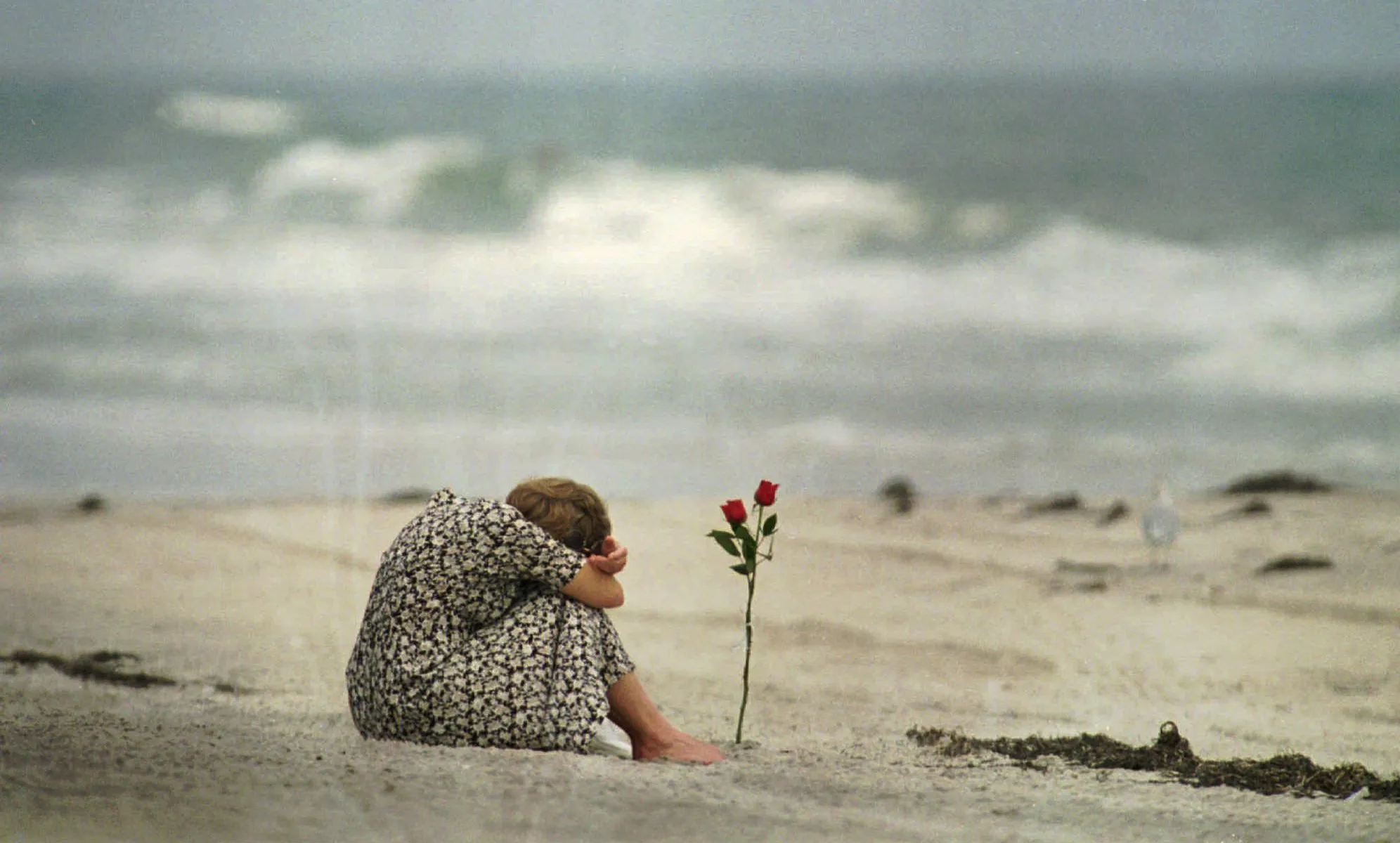 Sitting near a rose she placed in the sand at Smith Point beach in Fire Island, N.Y. , a woman mourns the loss of some of her friends Friday July 26, 1996, who were part of the TWA flight 800 flight crew. The Navy is still searching for victims and parts of the plane. (Photo by Mark Lennihan/AP Photo)