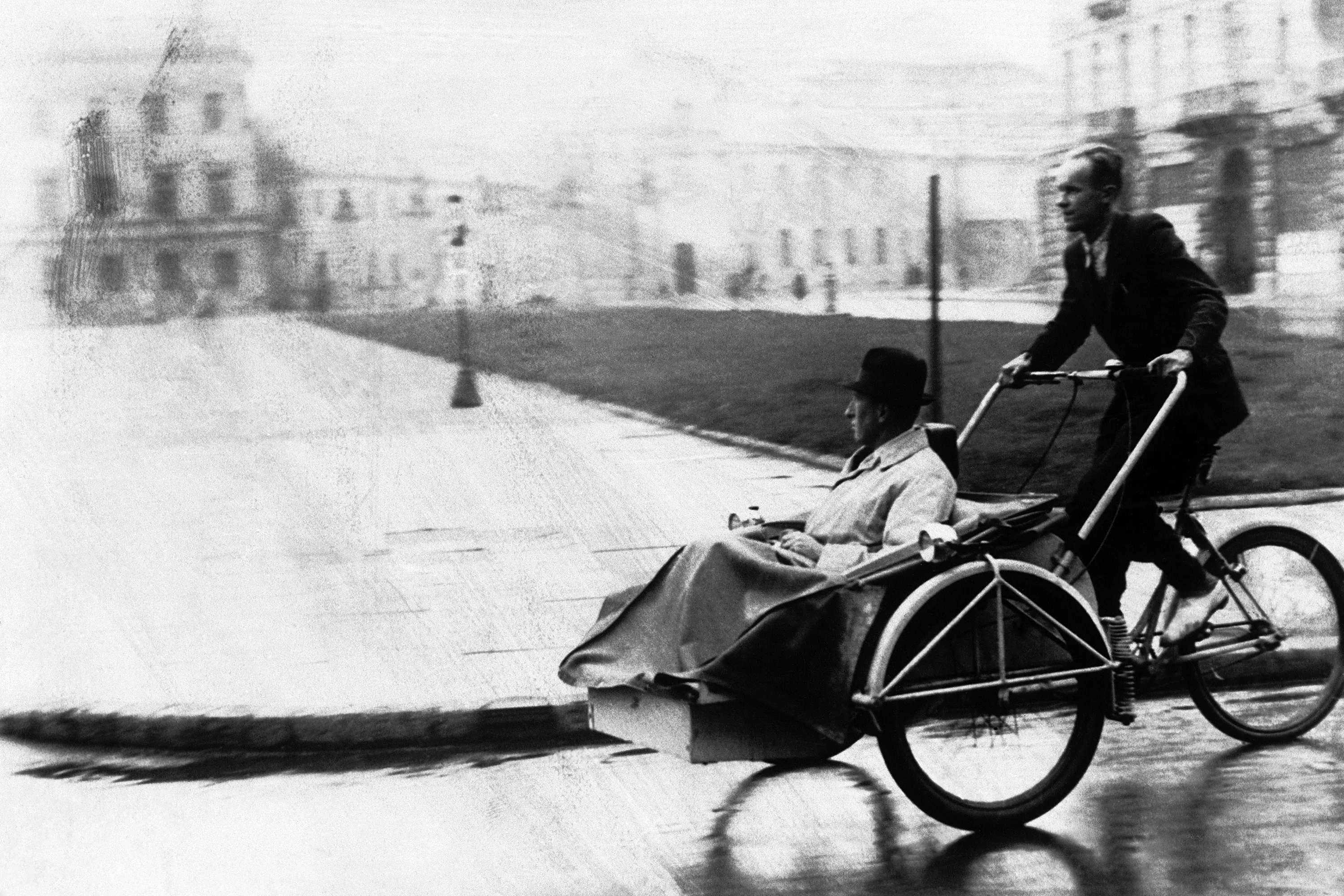 A photographer on his way to the Warsaw Ghetto, Poland, on February 17, 1941, using a bicycle taxi now common in many European cities. (Photo by AP Photo)