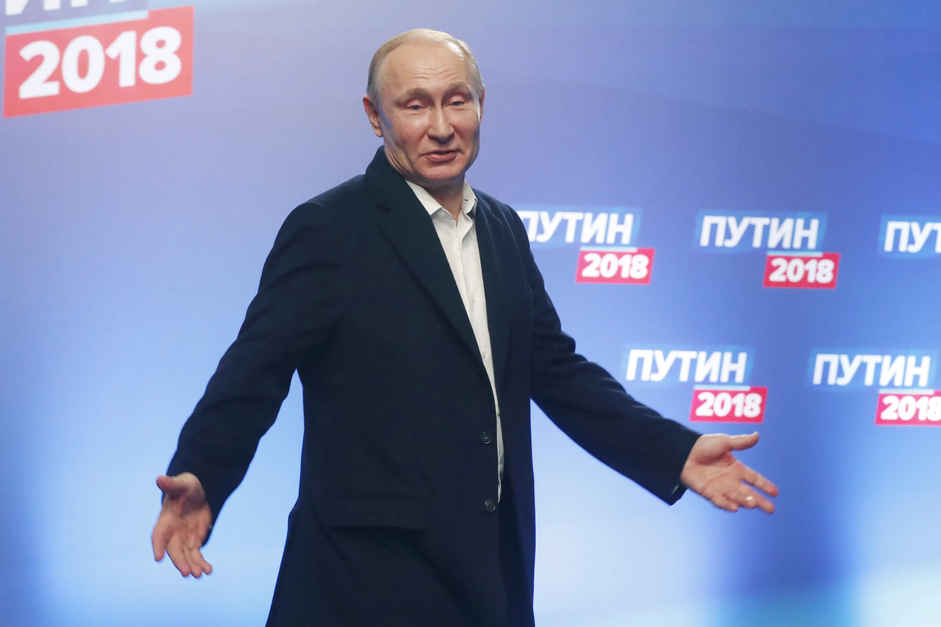 Russian President Vladimir Putin gestures during a news conference after meeting with his staff at the campaign headquarters in Moscow, Russia, Sunday, March 18, 2018. Russian President Vladimir Putin has dodged a question about his plans after serving another six-year term he has won. Putin wouldn't be eligible under the constitution to compete in the 2024 election since there is a limit of two consecutive terms. (Photo by Sergei Chirikov/Pool photo via AP Photo)