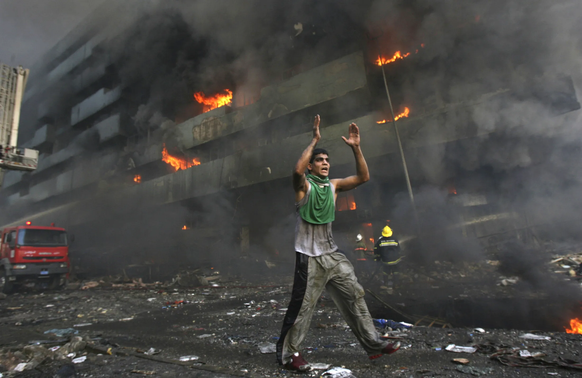 A man runs down a street warning people to flee shortly after a twin car bomb attack at Shorja market in Baghdad, February 12, 2007. (Photo by Ceerwan Aziz/Reuters)