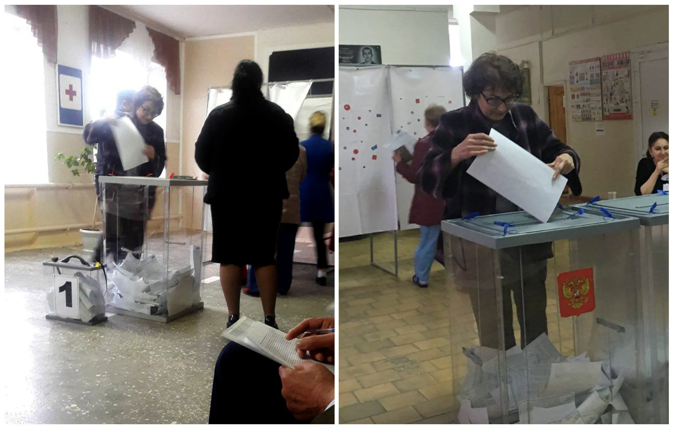 A combination picture shows voter Ludmila Sklyarevskaya, who denied voting multiple times, casting a ballot at a polling station number 215 (L) and casting a ballot at a polling station number 216, during the presidential election in Ust-Djeguta, Russia March 18, 2018. (Photo by Reuters/Staff)