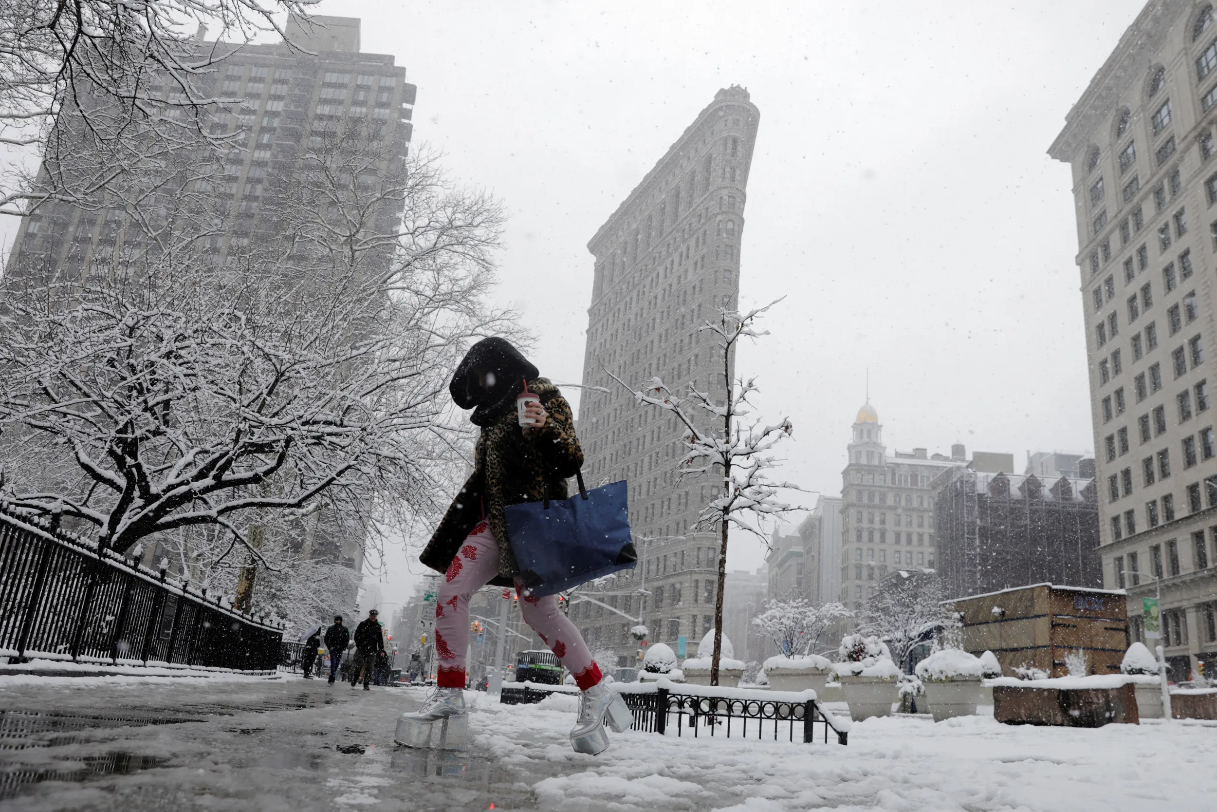 A pedestrian wearing platform shoes crosses the street during a late season nor'easter in New York, U.S., March 21, 2018. (Photo by Lucas Jackson/Reuters)