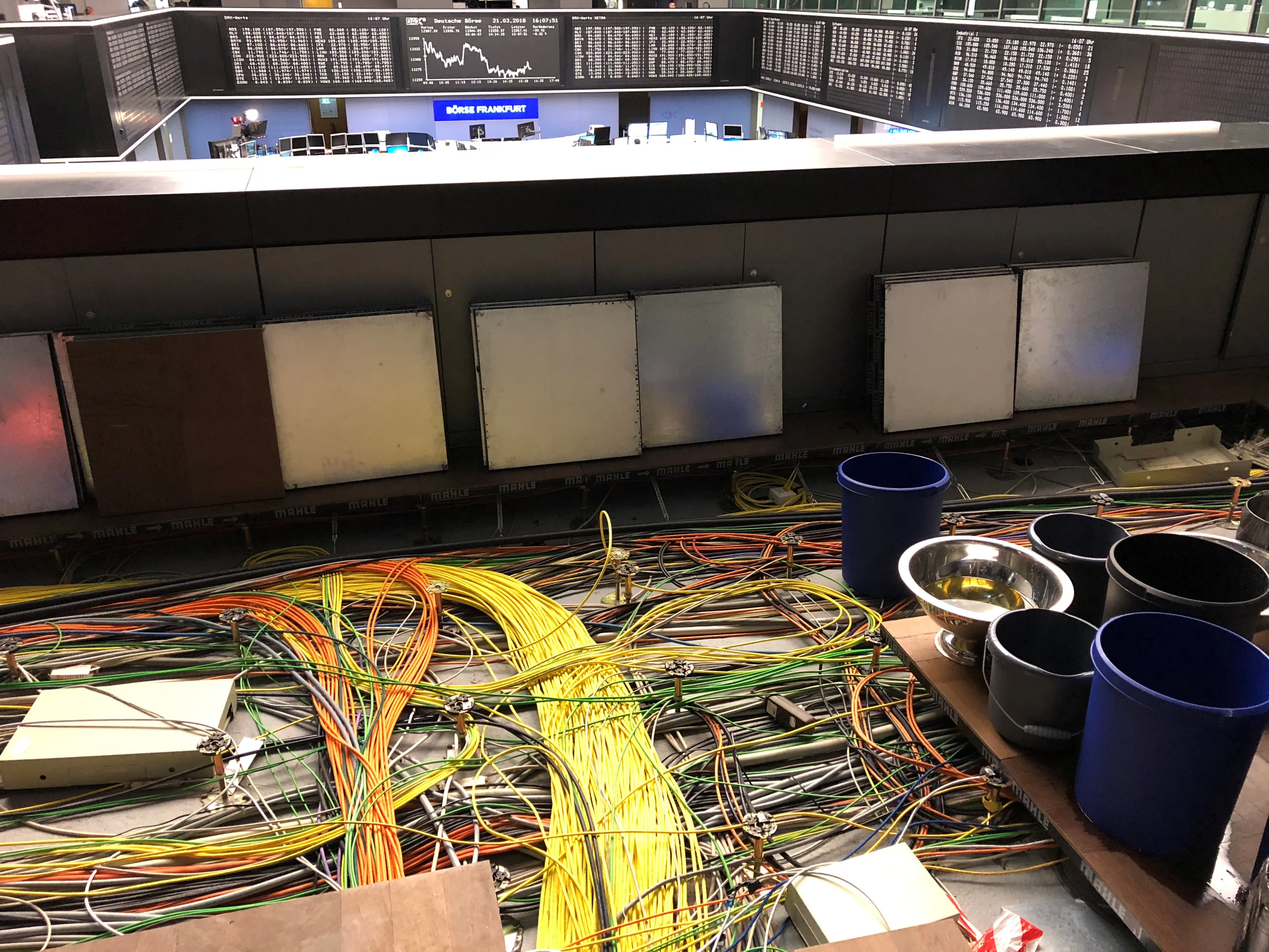 Cables are visible after large parts of the gallery floor have been taken away because of a faulty sealing water leak, early morning at the stock exchange in Frankfurt, Germany March 21, 2018. (Photo by Kai Pfaffenbach/Reuters)