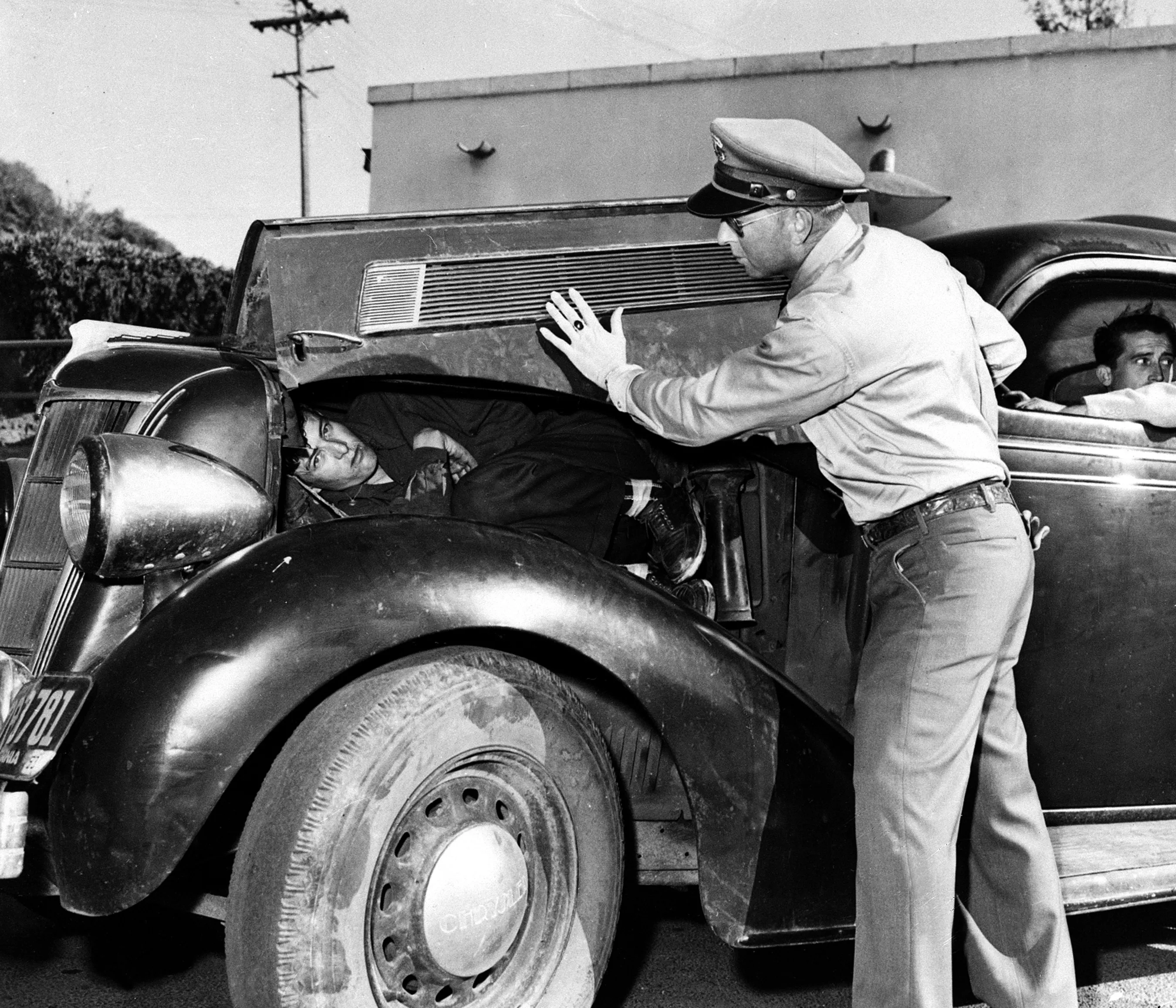 U.S. Border Patrol officer Richard McCown shows how he found Felipe Ramirez Perez, a 6-foot illegal Mexican immigrant, curled up on the engine beneath the hood of this automobile, at the U.S.-Mexican border at San Diego, Calif., March 15, 1954. Perez is held for illegal entry, awaiting deportation, and Felix Mercado Gutierrez, the driver of the car, is charged with attempt to smuggle Perez into the United States. (Photo by AP Photo)